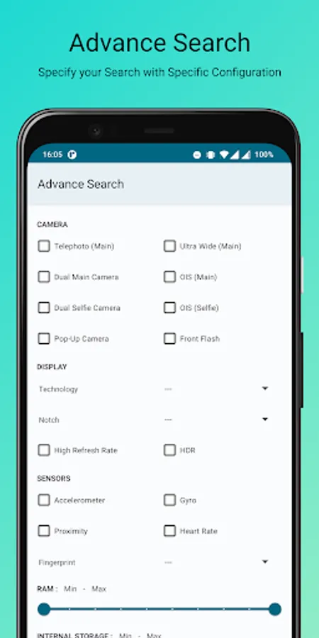 Find gadget more easily with advance search, you can also filter based on certain features and specifications, such as storage capacity, RAM size, battery size, brands, etc and other features will be add in further development
