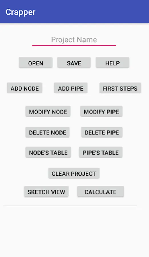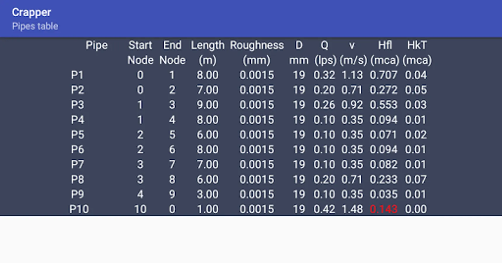 Crapper is intended as a tool to help proffessionals to design water suply systems with the Hunter Method. It can calculate friction and local healosses and automatically sets K for direction changes were are needed. Crapper can calculate pressure an flow at the supply point of a water supply system using the Hunter Method, fixture units. Results can be saved in a csv file and you can prepare your own files to be readed by Crapper and then calculated the system. There are no limit on nodes and pipes.