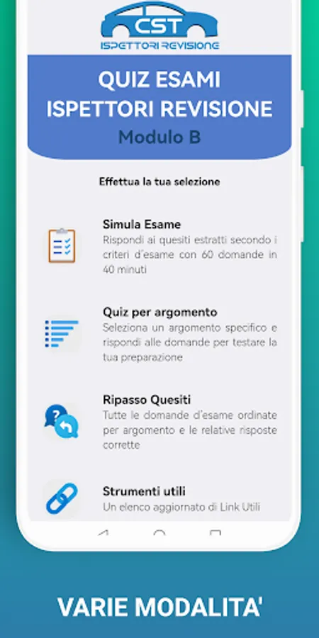 Inspector Exam Quiz Revision is an APP dedicated to all those who have attended or are attending the Inspector Training Courses Revision Module B (Light Vehicles) and / or Module C (Heavy Vehicles) to provide future Inspectors with a valid tool in order to test their preparation before taking part in the qualification exam for registration in the Single Inspectors Register.