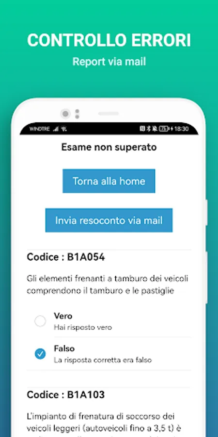 At the end of the test it is possible to obtain a report of the incorrect answers and to send a report via email containing the details of the errors made and the corresponding correct answer.