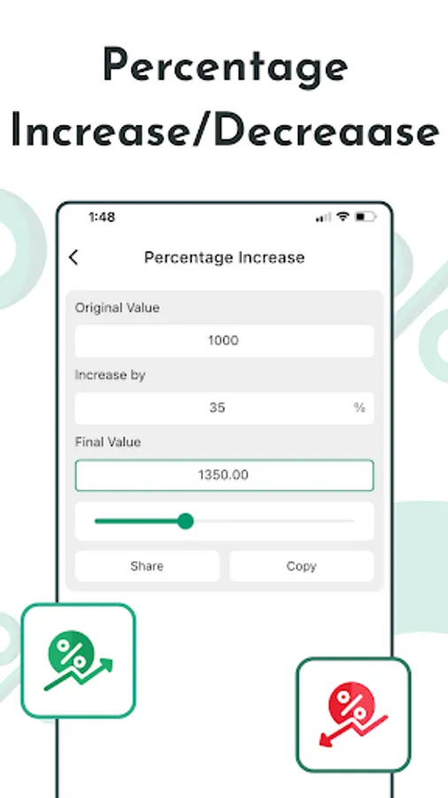 percentage calculator of marks grade is one of the fastest percentage calculator free app designed with simplicity and performs various calculations instantly. Do you face difficulties while calculating simple percentage? No need to worry more! Just enter any two values and the third one is computed. With this Percentage calculator free app you can calculate tip percentage, although just enter your sale price and calculate your discount percentage. You can compare products with various quantities and prices and calculate the percentage of price/quantity. Percentage calculator of marks grade allows you to calculate percentage increase or decrease from a difference of two different values. You can easily convert proper and improper fractions to percentages through this Percentage calculator Free also it determines the percent value for a fraction. Thus, you can perform various calculations in just a couple of seconds through this perfect percentage calculator of marks grade app.
