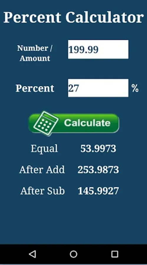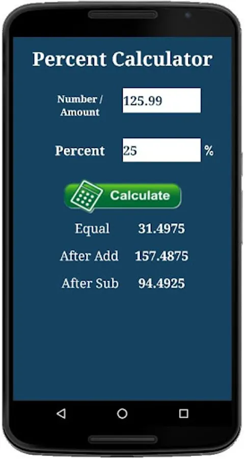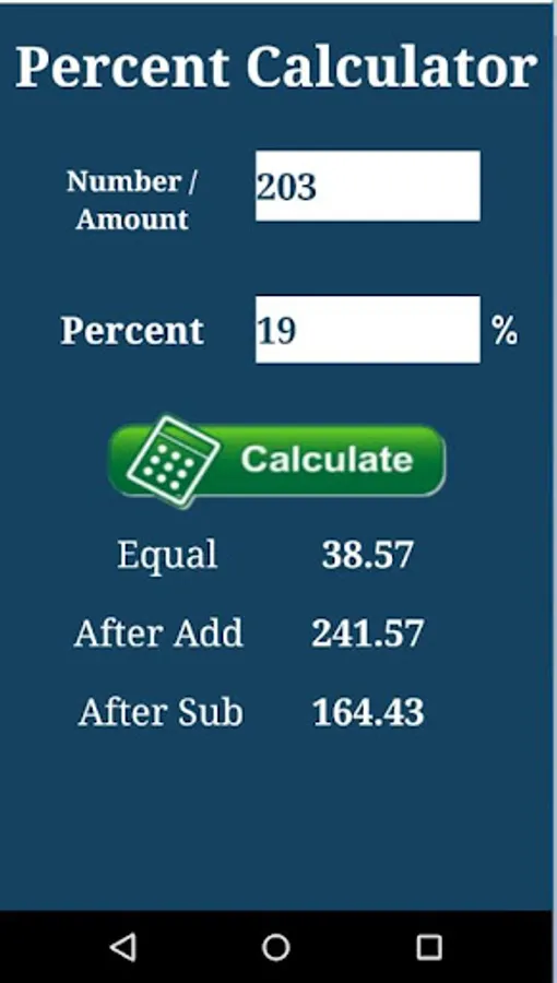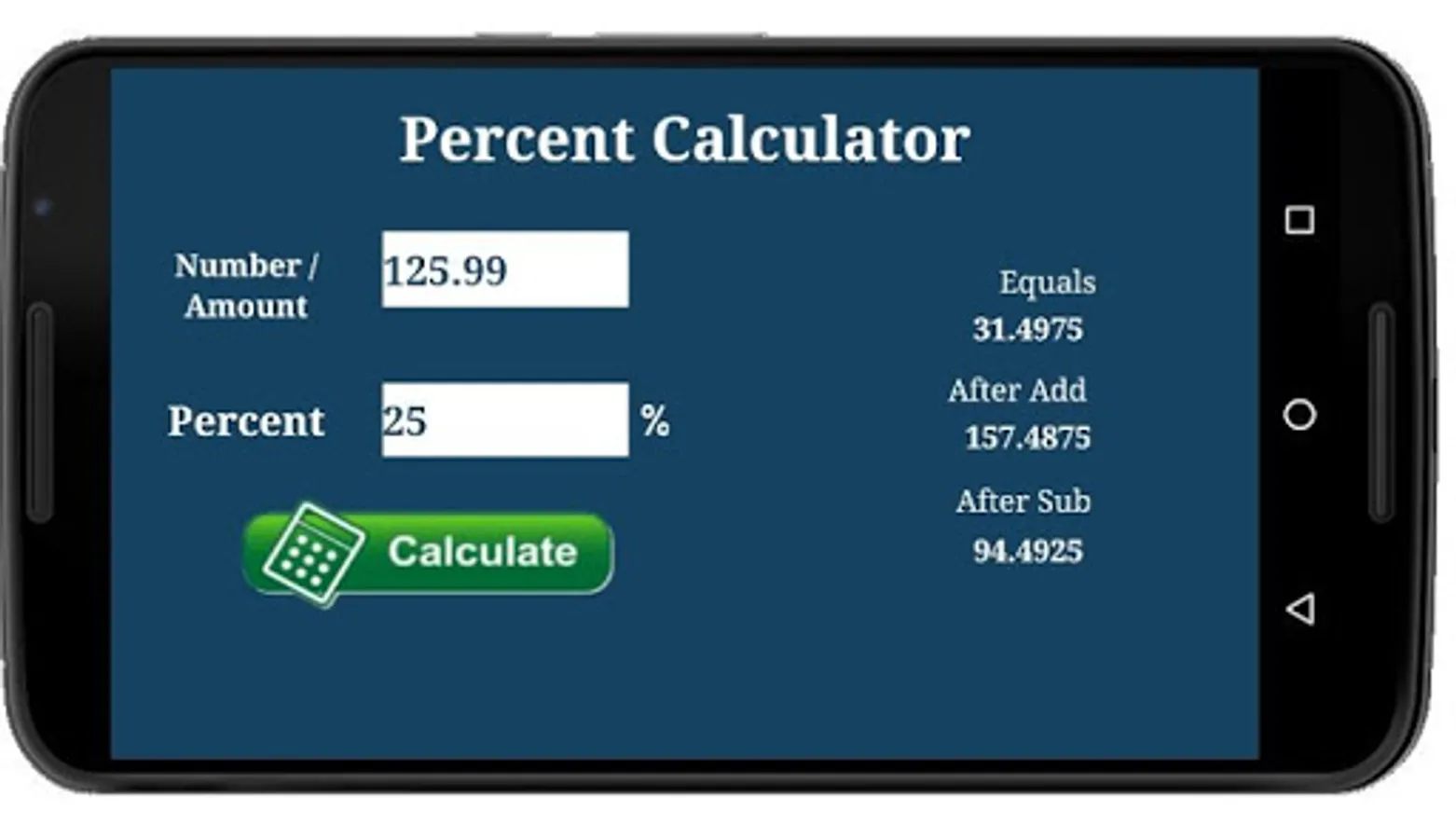 Great app for those who calculate the percentage a lot, also the app calculate the After Adding the percentage to the amount or After Subtracting the percentage from the amount or the number.
