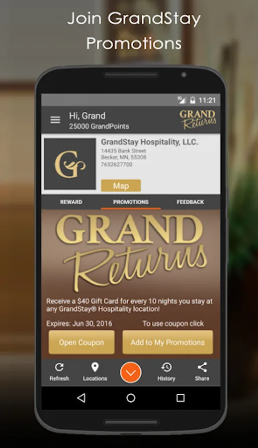 We know guest loyalty is nothing to take lightly. That’s why we established our Grand Returns program to say thank you for choosing to stay with us. Whether you stay one night at a time or for an entire month long extended stay, get rewarded for every night you spend at one of our GrandStay® Hotels or Crossings by GrandStay®. Help yourself manage your personal information, setup your interests and preferences, get notified with upcoming/active promotions and many more. The Grand Stay app lets you monitor all your GrandStay tidings from your fingertips.