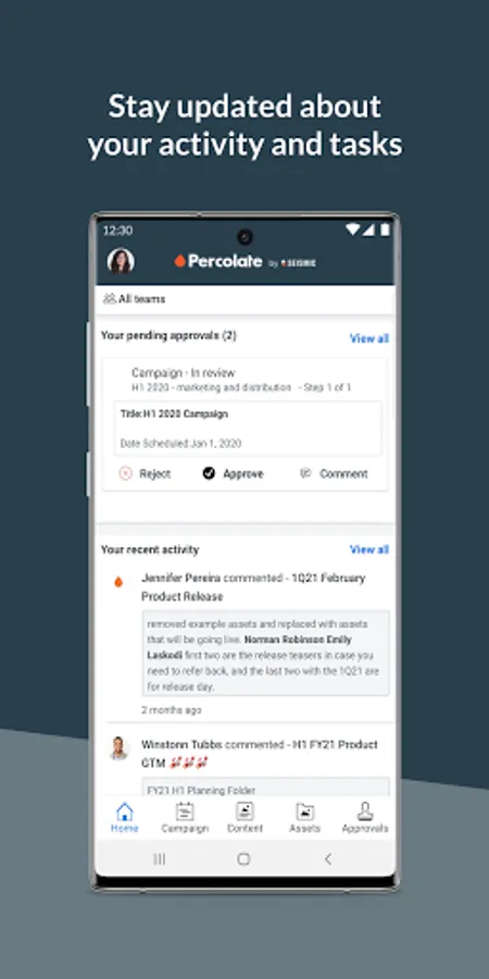 Percolate is the System of Record for Marketing. Percolate’s mobile app enables senior marketers to govern their brands on the go. Breeze through approvals on your own time to keep your team moving without roadblocks. See everything happening across your brand in a simple activity stream where you can trigger action as needed via comments and @mentions.