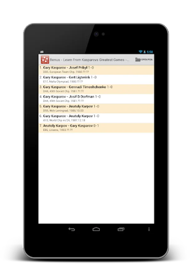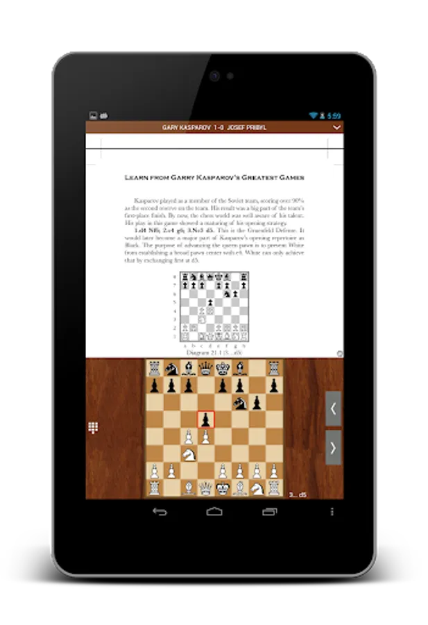 ♚ This app comes with a sample copy of "Bonus chapters from the book - Learn from Garry Kasparov’s Greatest Games" by FM Eric Schiller (http://ericschiller.com/)
