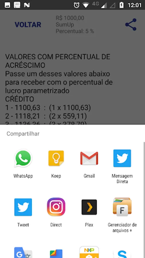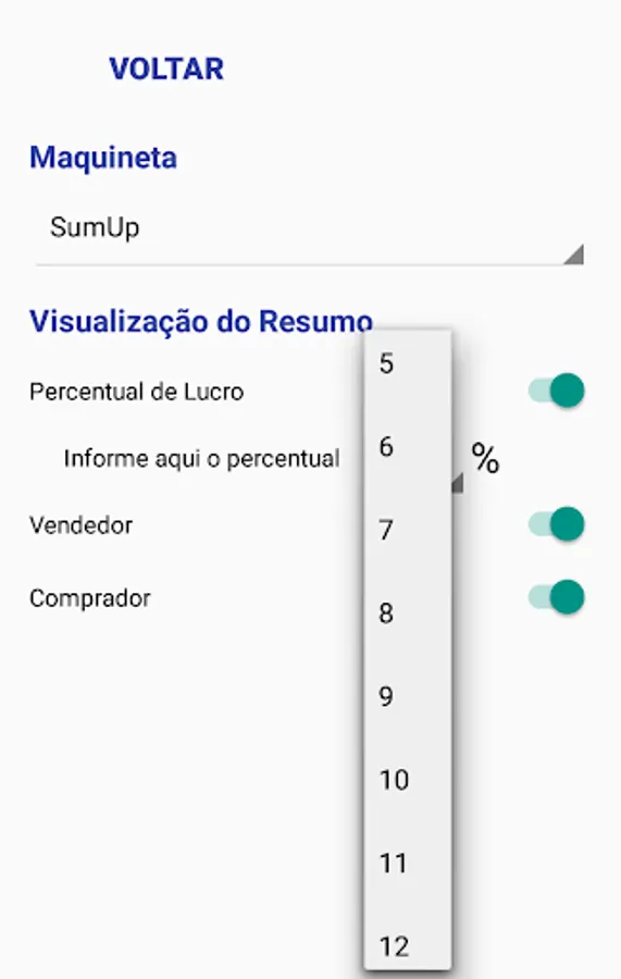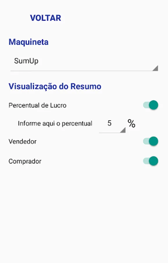1. Profit percentage: you define a profit percentage that you want to receive on your sale, for example: a product that costs R$100.00, but you want to receive R$105.00 in debit from SumUp, so you must go through the machine the amount of R$107.03, because when you withdraw the percentage from the operator, you will receive the amount of R$105.00.