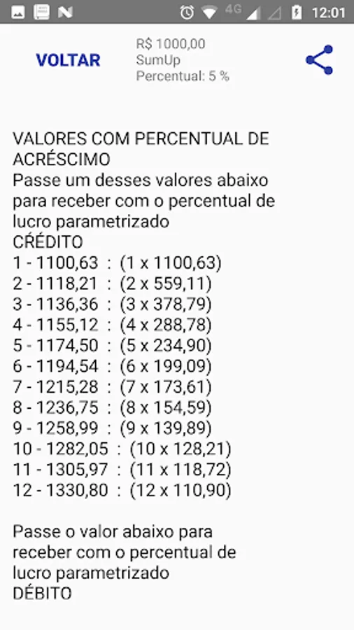 3. Buyer Fee: Here you will be informed of the amount you must pass to receive the same amount informed, example: to receive the amount of R$100.00 in debit, you must pass a value of R$101.94 in the SumUp machine, with this you will receive R$100,00