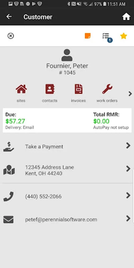 View all your customers and see all the information regarding the customer. The intuitive search feature allows you to easily find any customer by name or customer number. Then you can view all the customer data; including address, phone number, email, amount due, active RMR. With a simple click you can the view the details for that customer including; invoice history, RMR in force, contact, work orders, payment history and notes.