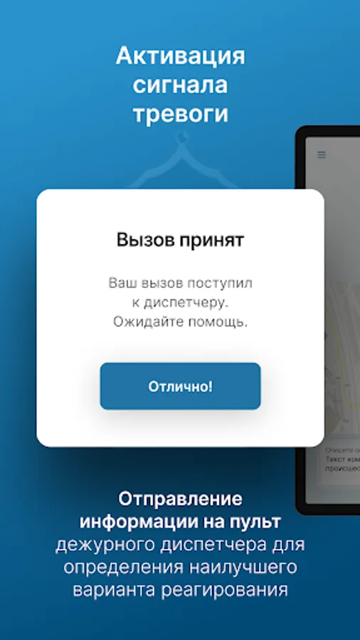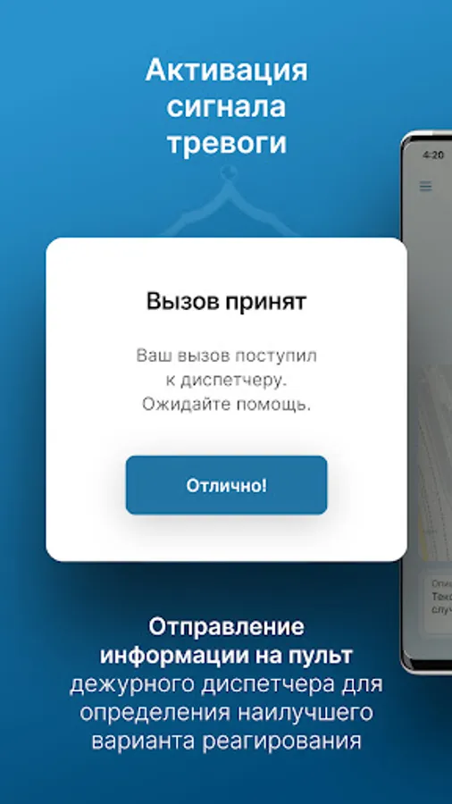 В момент активации тревоги приложение определяет местоположение и отправляет данные, содержащие в себе необходимую информацию, на пульт дежурного диспетчера, который определяет наилучший вариант реагирования на ваш вызов.