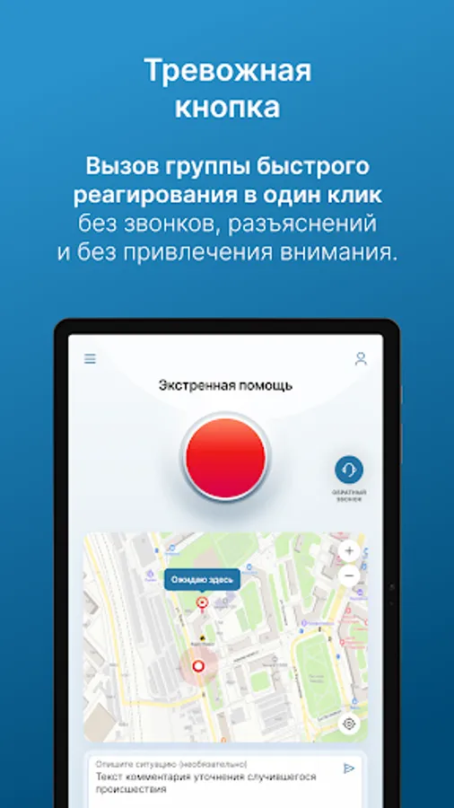 Тревожная кнопка вызова группы быстрого реагирования на вашем мобильном устройстве и на устройстве ваших детей, родных и близких дает возможность произвести вызов о помощи в один клик без звонков и разъяснений, а самое главное, в экстренной ситуации - без привлечения внимания.