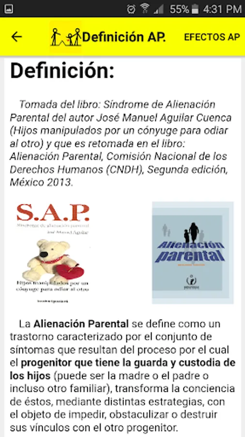 Parental Alienation is an increasingly common problem among families in many countries. International law in conjunction with laws in several countries seeking to assert the child's best interests and reverse this serious problem that has serious social repercussions. This application seeks to raise awareness among family members (parents and children) who are experiencing this problem in their daily lives well aware of the serious consequences individually and collectively in this form of psychological abuse called Parental Alienation.