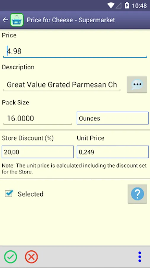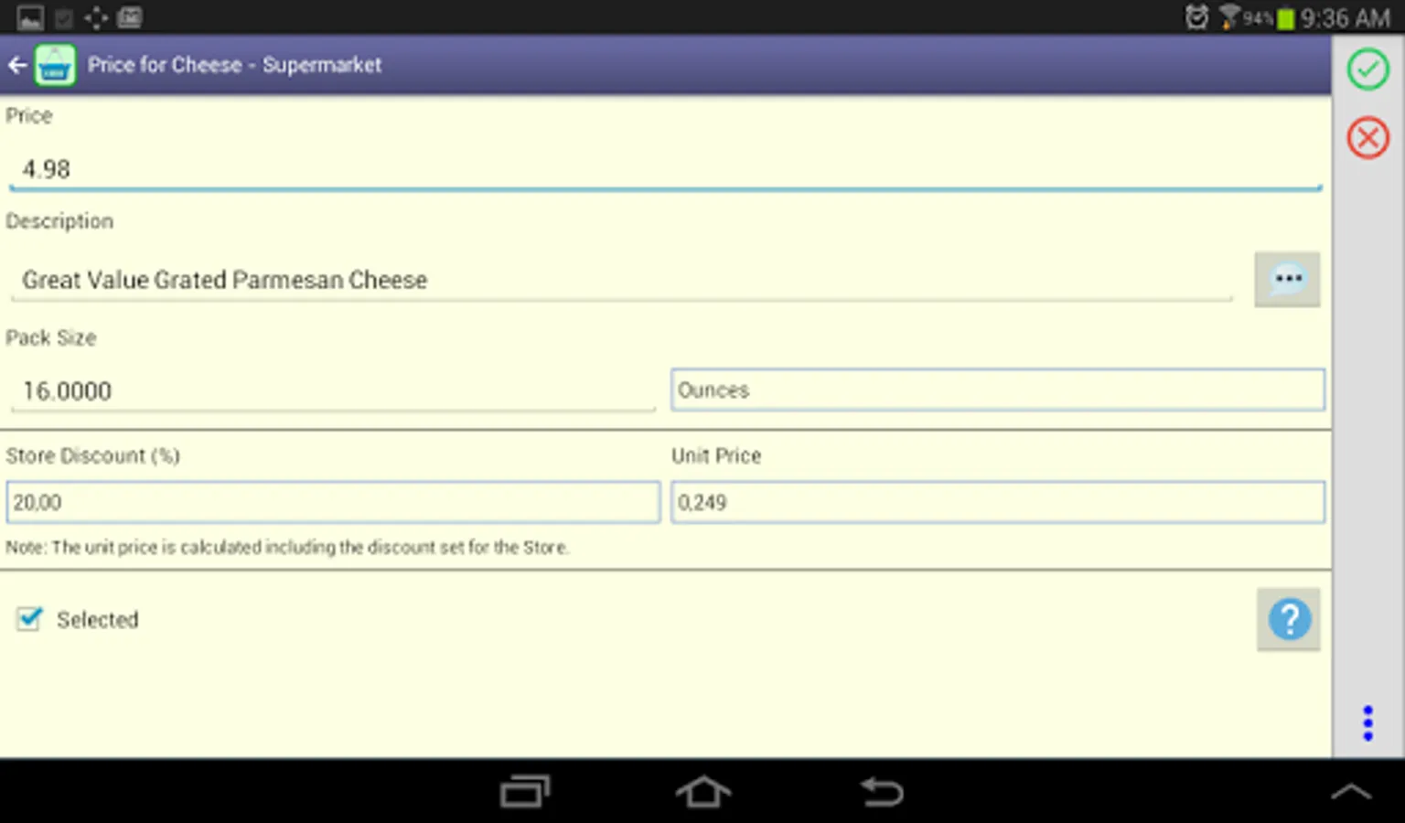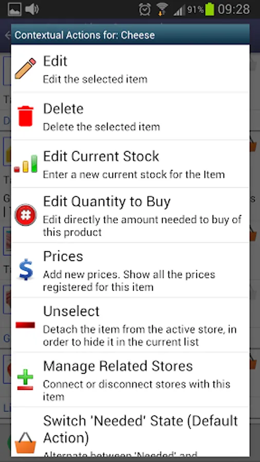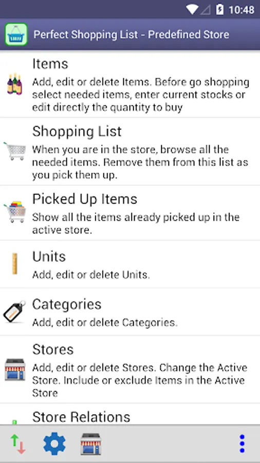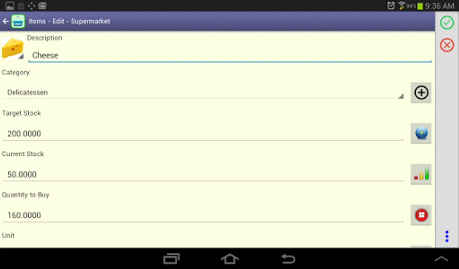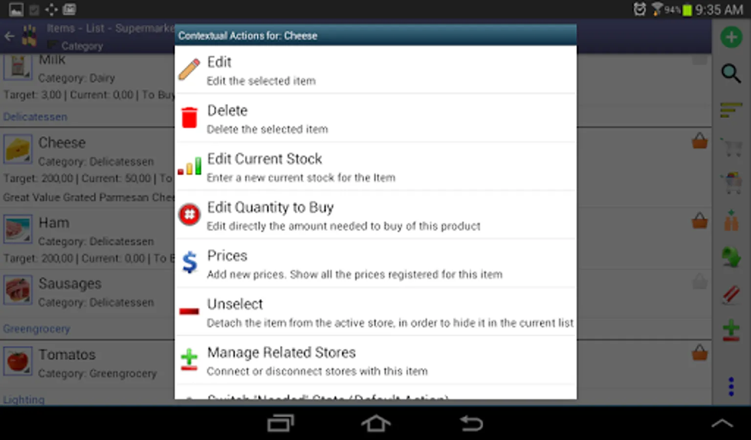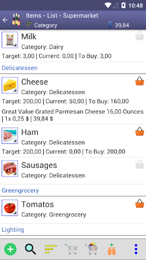 Perfect Shopping List can also store the target stock for each item. Before go shopping, you can enter the current stock and Perfect Shopping List will calculate the necessary amount to reach the target stock.