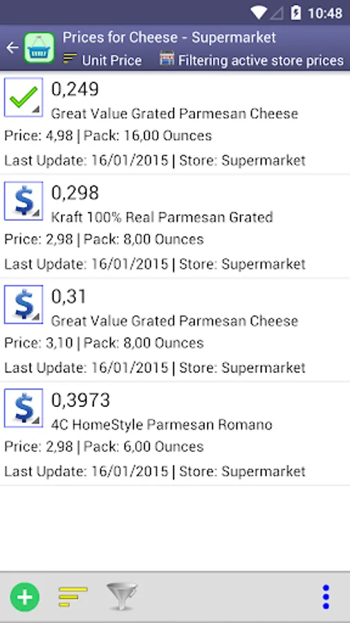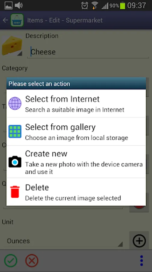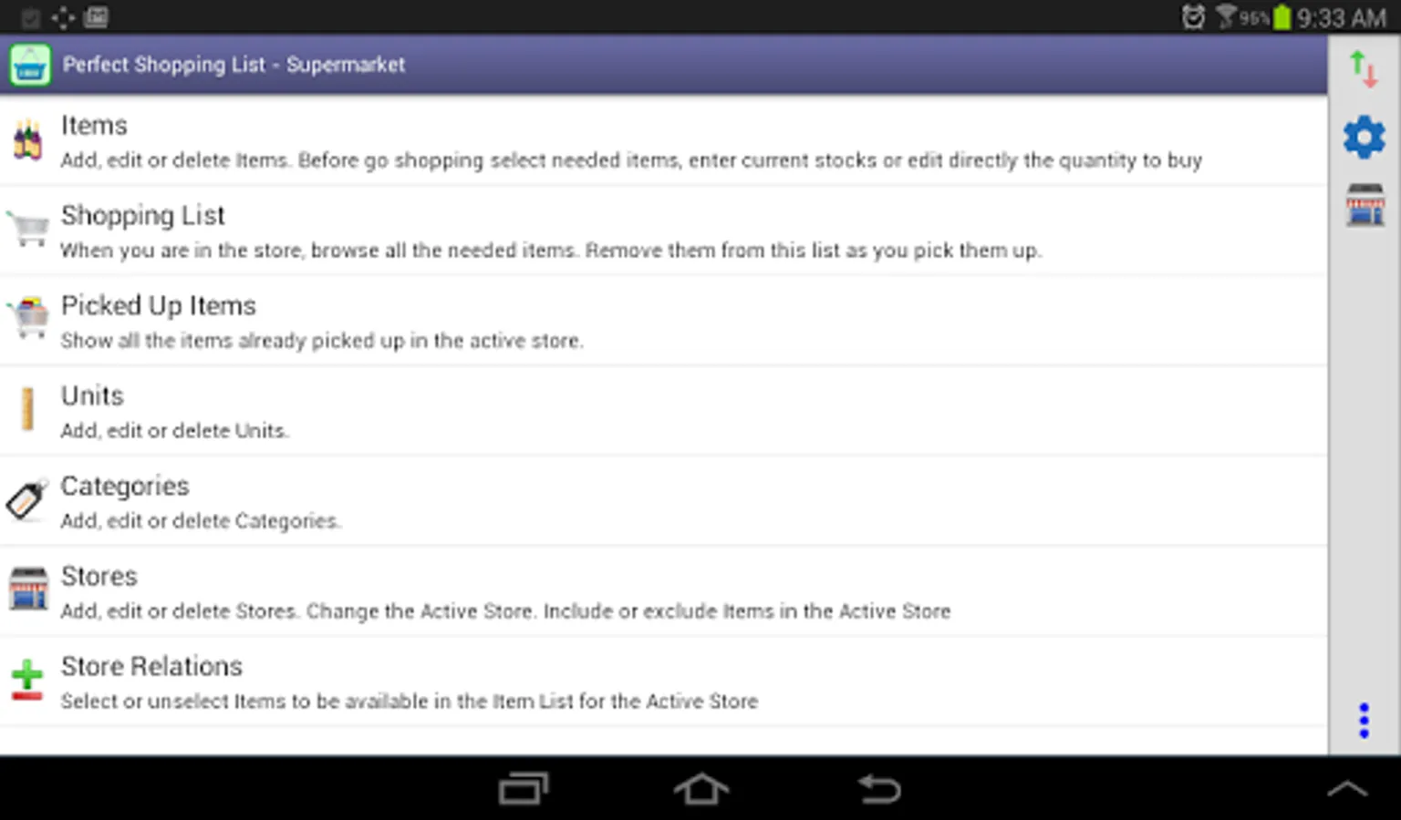 There are two main views: items and shopping. In the item list you will be able to add, delete and modify items, in addition to mark those that you need to buy. The shopping list only shows the items marked as “necessary”. When an item is unmarked it will be removed from this list, so you only see what is pending to buy.
