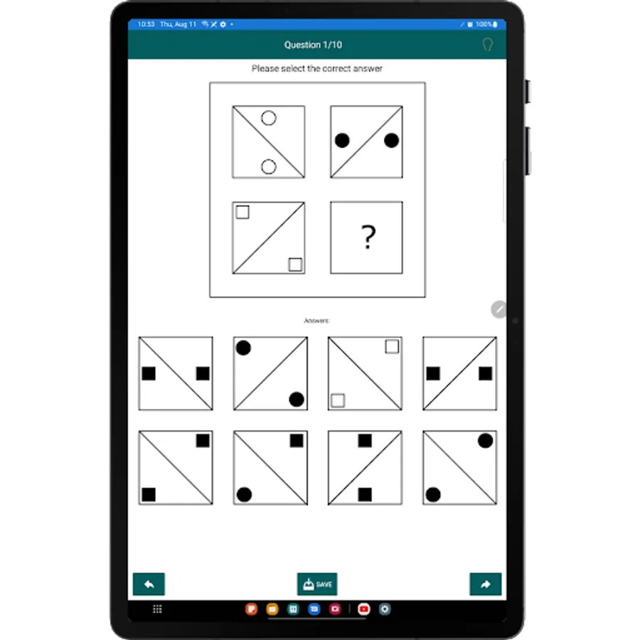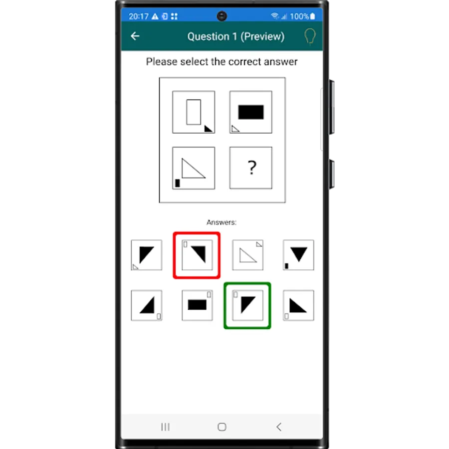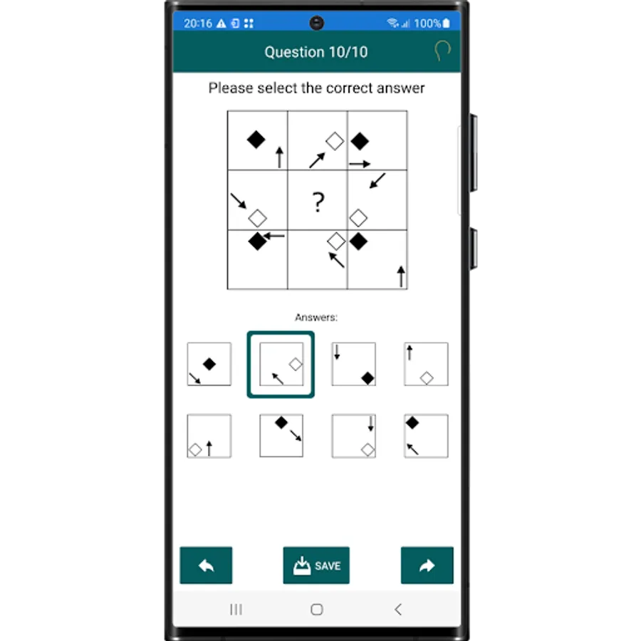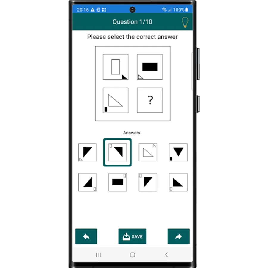 This app consists of total 30 multiple-choice RPM/SPM/APM questions. On each test you will get 10 random questions with similar difficulty. You will be given 8 choices from which to select and complete the missing element.