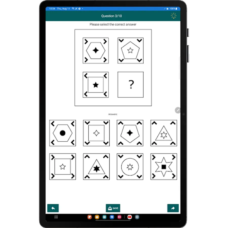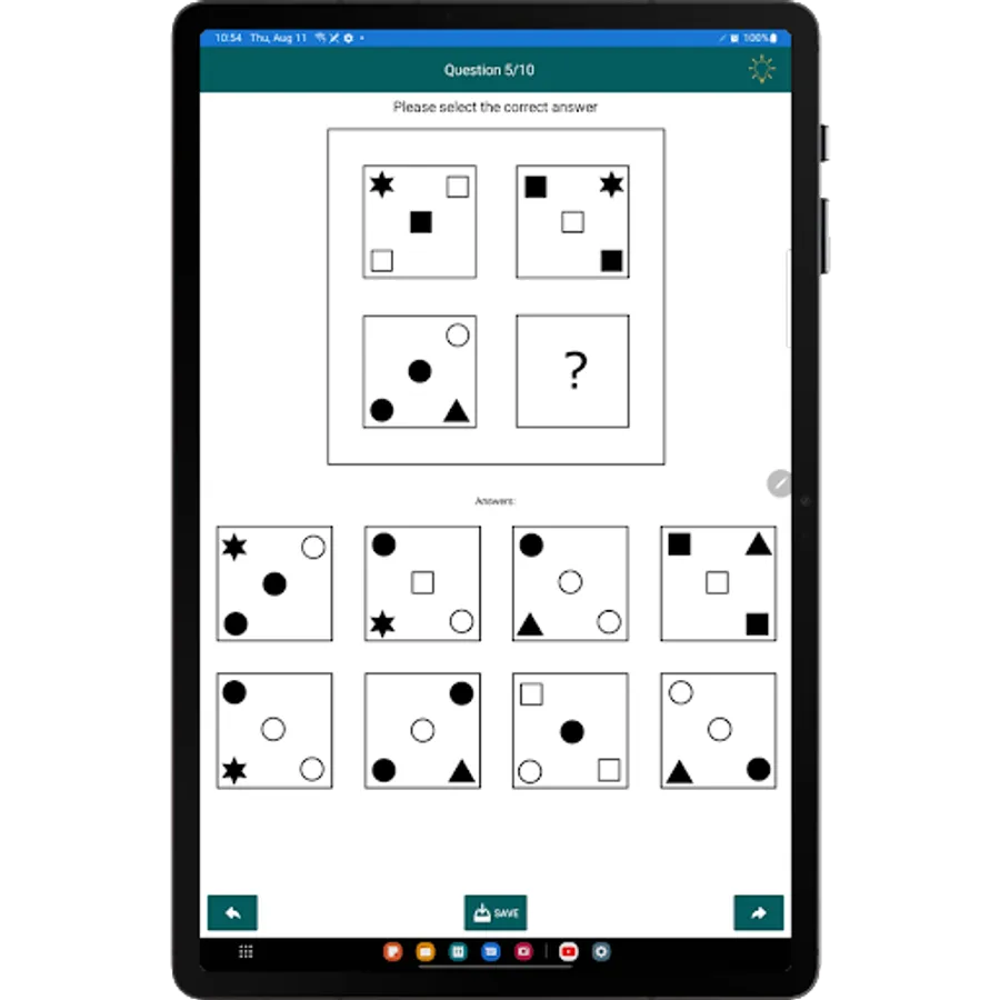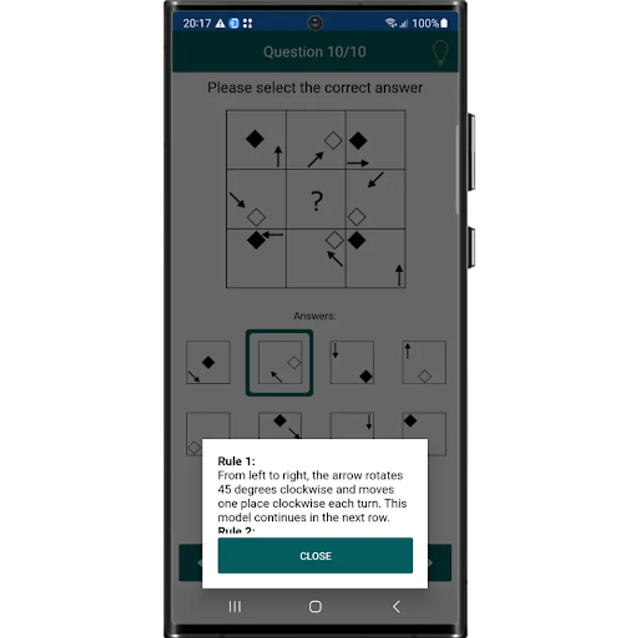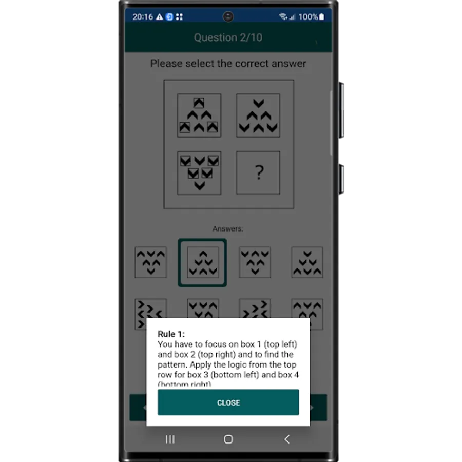 This app consists of total 30 multiple-choice RPM/SPM/APM questions. On each test you will get 10 random questions with similar difficulty. You will be given 8 choices from which to select and complete the missing element.