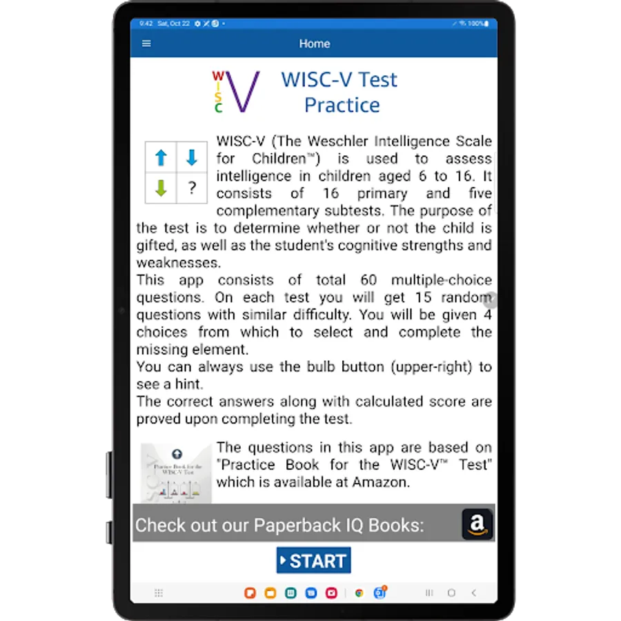 This app will help you to practice and prepare for Wechsler Intelligence Scale for Children (WISC-V®) Test. It consists of total 60 multiple-choice questions. On each test you will get 15 random questions with similar difficulty.