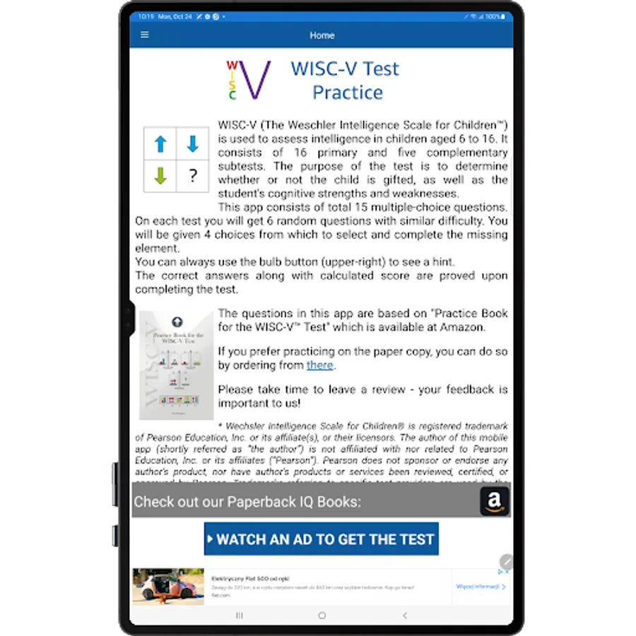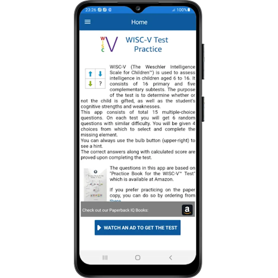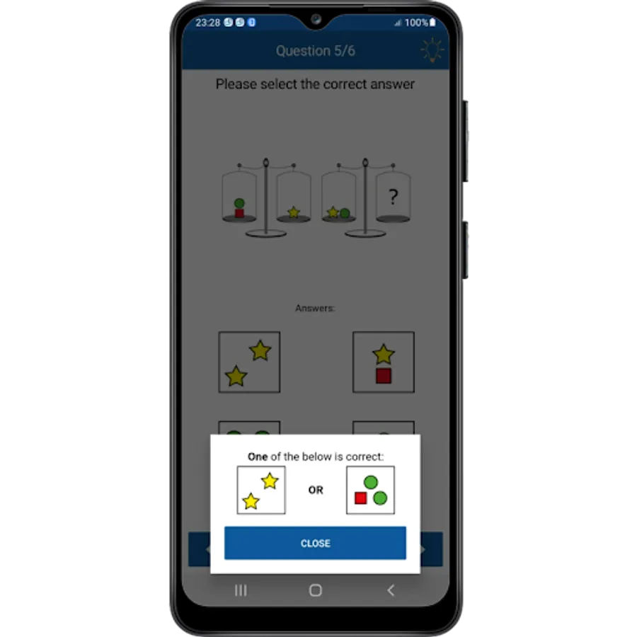 This app will help you to practice and prepare for WISC®-V Tests. It consists of total 15 multiple-choice questions. On each test you will get 6 random questions with similar difficulty.
