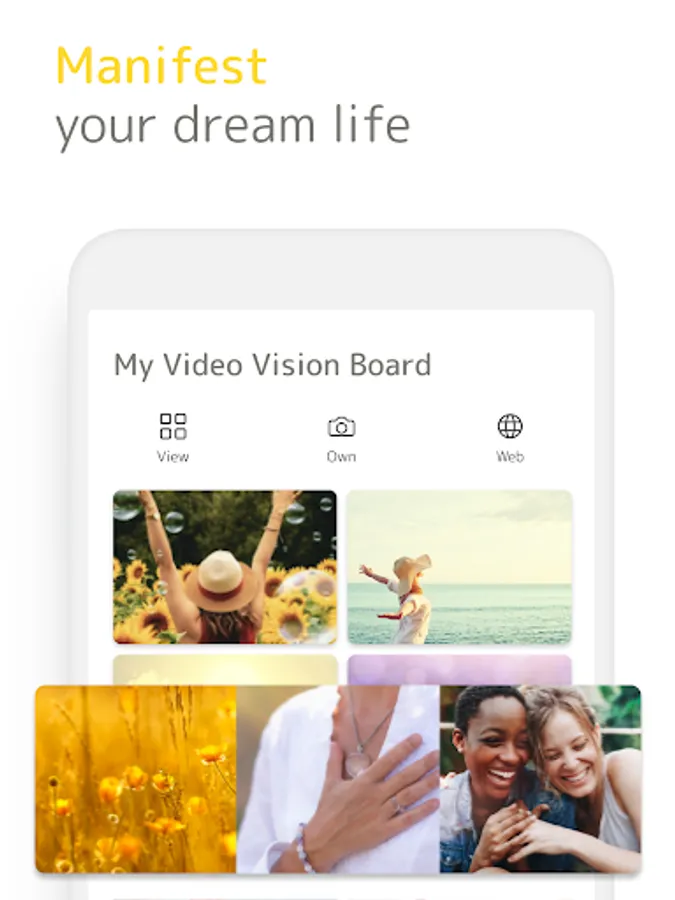 You can create your own personalized VISION BOARD in just a few minutes. A vision board is a collage of images that you use to visualize your goals. With the Perfectly Happy Vision Board app, you can easily combine your own photos with images from the web or thousands of images provided by us. In addition, you can accompany your images with positive affirmations and emotional music for better results. The app combines them and creates an inspiring, personalized vision board video clip for you. The more vivid your vision, the easier it becomes to manifest.