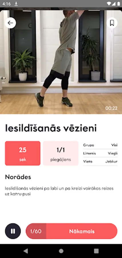 Katrs treniņš ir sadalīts vingrojumos. Video redzams detalizēta un pareiza vingorjuma tehnika, atkārtojumu skaits un vingrojuma laiks.