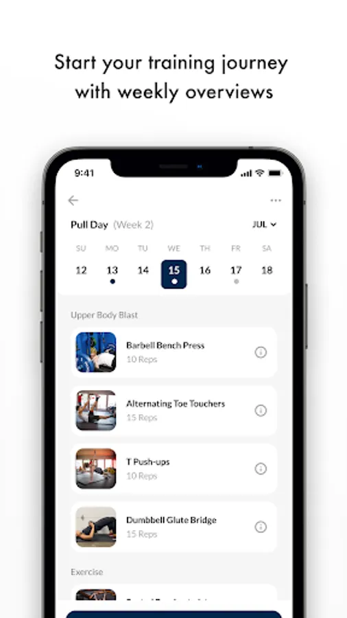 Finally, you’ll spend most of your time in the Train tab. Here, you’ll have a full breakdown of your program week over week. See what days you need to train, the overview of exercises for that day, and then click into the plan to get started.