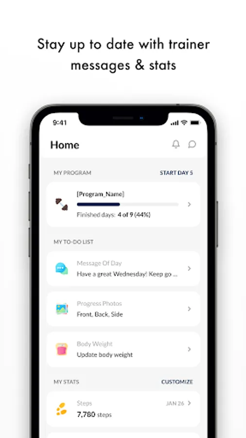 From the home page, view the messages from your fitness coach, view your daily fitness statistics, and see your daily nutrition overview. On this page, we also work with the Apple Health App to keep track of your steps and calories burned.