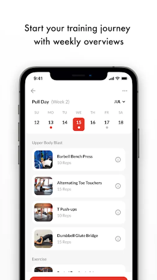Finally, you’ll spend most of your time in the Train tab. Here, you’ll have a full breakdown of your program week over week. See what days you need to train, the overview of exercises for that day, and then click into the plan to get started.