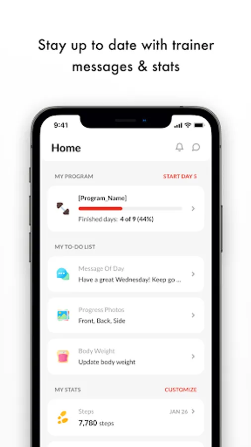 From the home page, view the messages from your fitness coach, view your daily fitness statistics, and see your daily nutrition overview. On this page, we also work with the Apple Health App to keep track of your steps and calories burned.