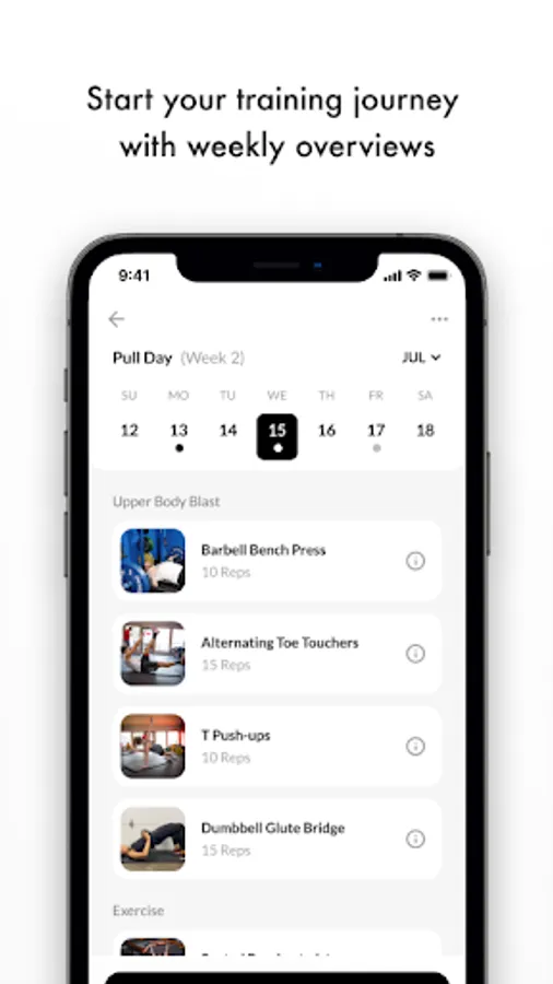 Finally, you’ll spend most of your time in the Train tab. Here, you’ll have a full breakdown of your program week over week. See what days you need to train, the overview of exercises for that day, and then click into the plan to get started.