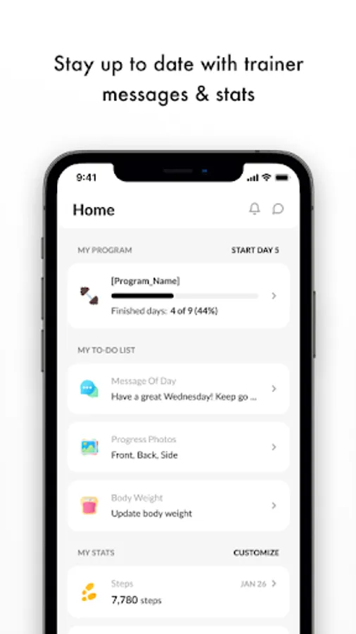 From the home page, view the messages from your fitness coach, view your daily fitness statistics, and see your daily nutrition overview. On this page, we also work with the Apple Health App to keep track of your steps and calories burned.