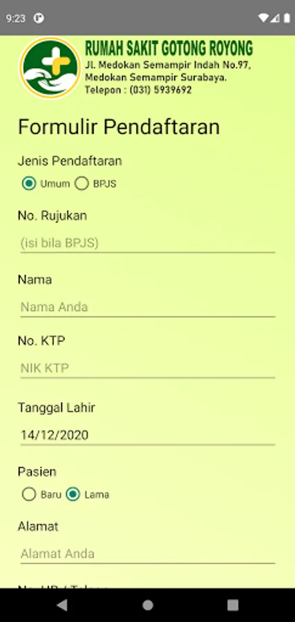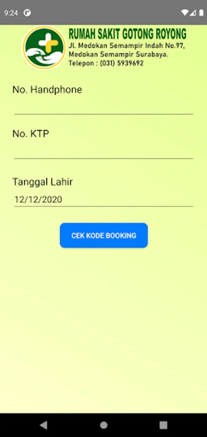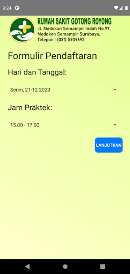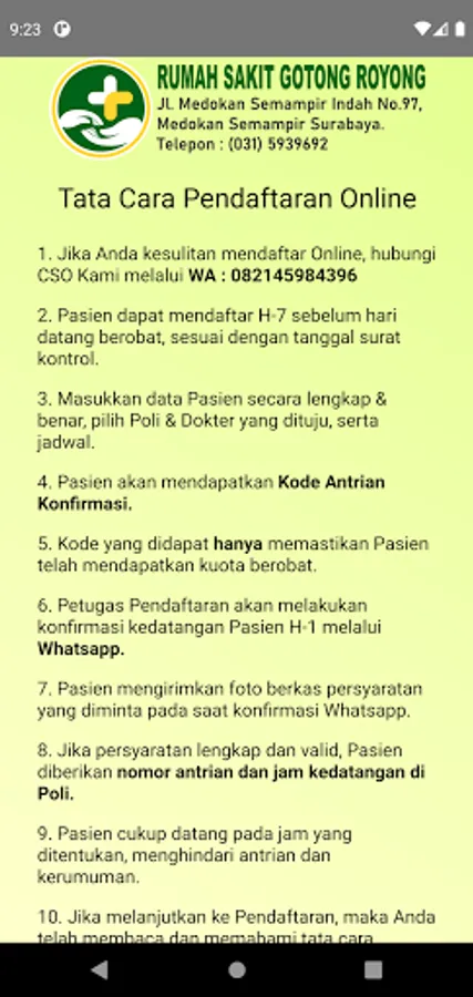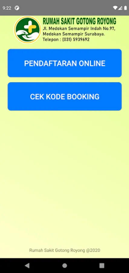 This application allows patients to register for a queue online without having to come to the place first. Additionally it is possible to register several days from today. This application aims to facilitate patients and improve the quality of Surabaya Gotong Royong Hospital registration.