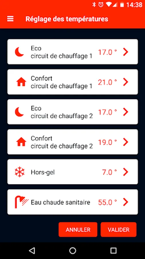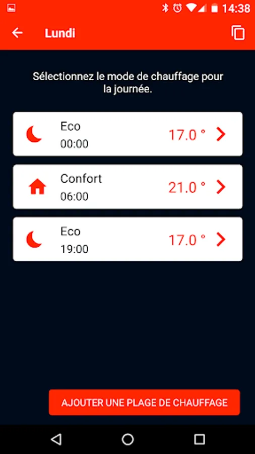 For each circuit, the user can define a daily programming of comfort and lowering temperatures without limitation of the number of time slots. A "copy" function makes it possible to apply the same program to several days. The comfort and lowering temperatures of each heating circuit are independent.