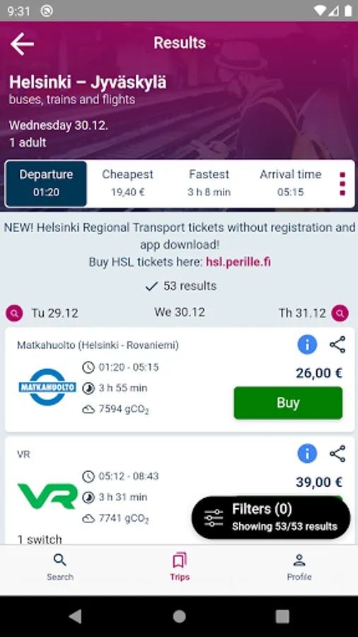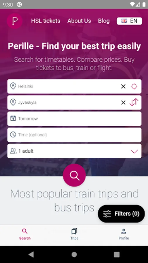 Travel easy! Perille is a route planner that makes planning your trip and buying tickets quick and easy. Perille app finds the best route and means of tranportation from long-haul options in Finland and commuter options within large cities. Choosing the most suitable option is easy with Perille - it helps you compare buses, trains, and taxi prices, travel times, the duration of travel and the environmental impact of the way of travelling. Alternatives can also be compared to your car. Happy Travels!