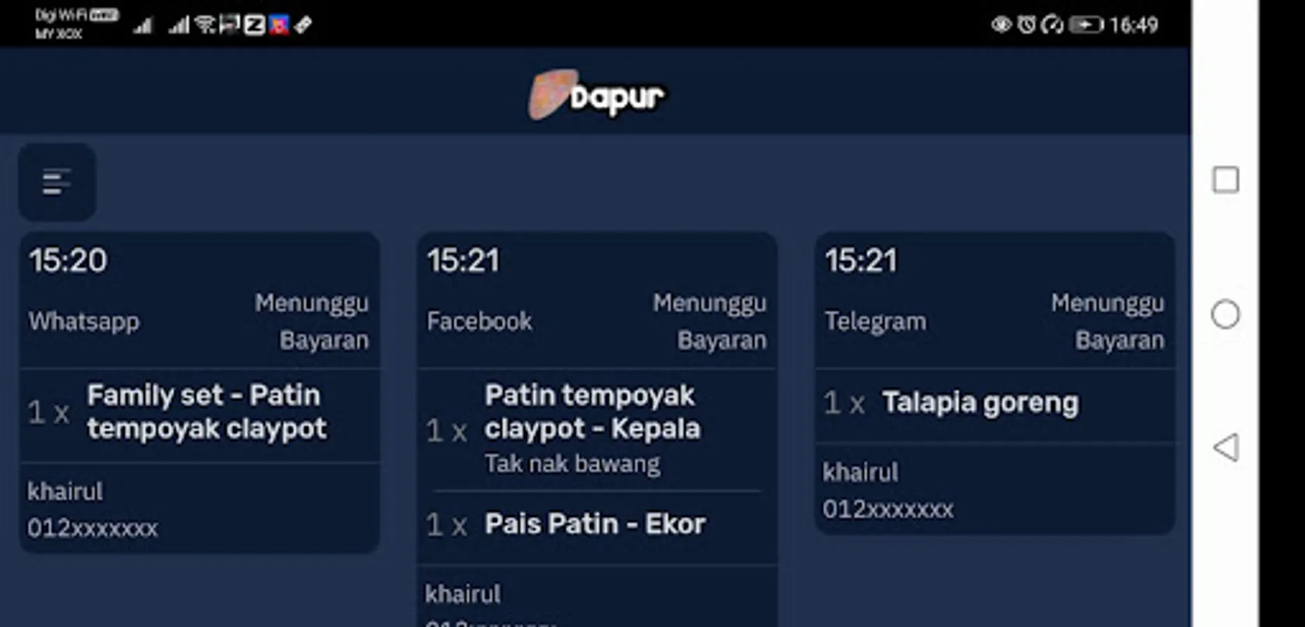 Receive food orders from various platforms such as whatsapp, telegram, facebook. Everything is displayed on one display