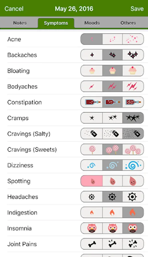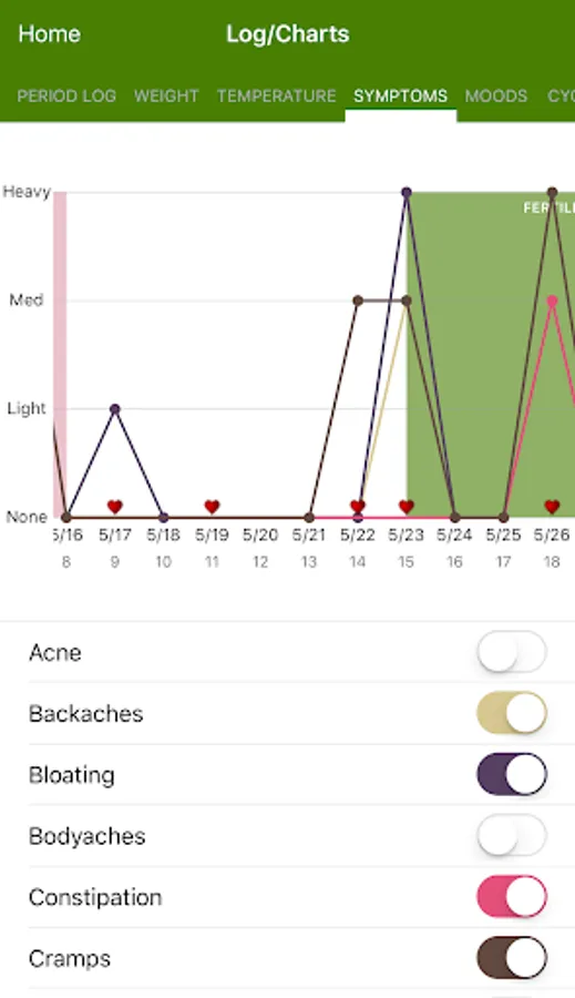 * View your current and future period dates, ovulation and fertile days, your moods and your symptoms in a simple month-view calendar.