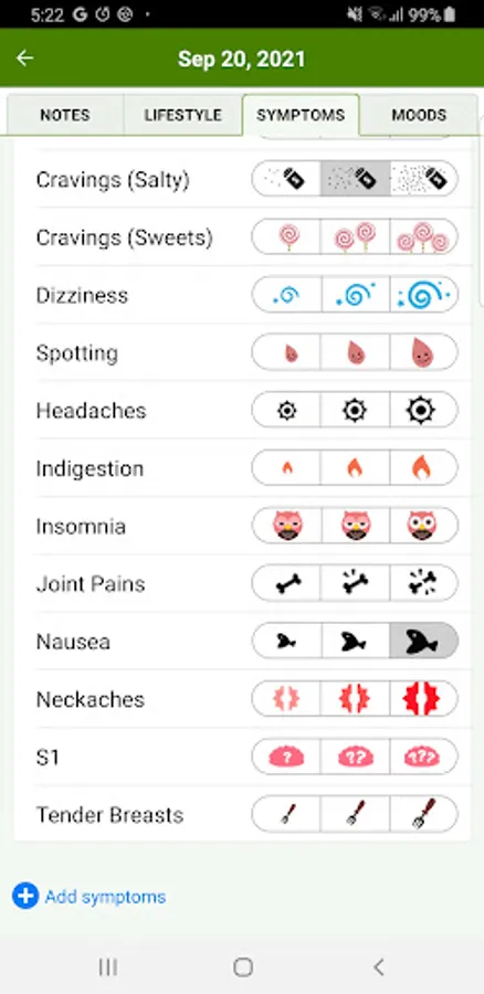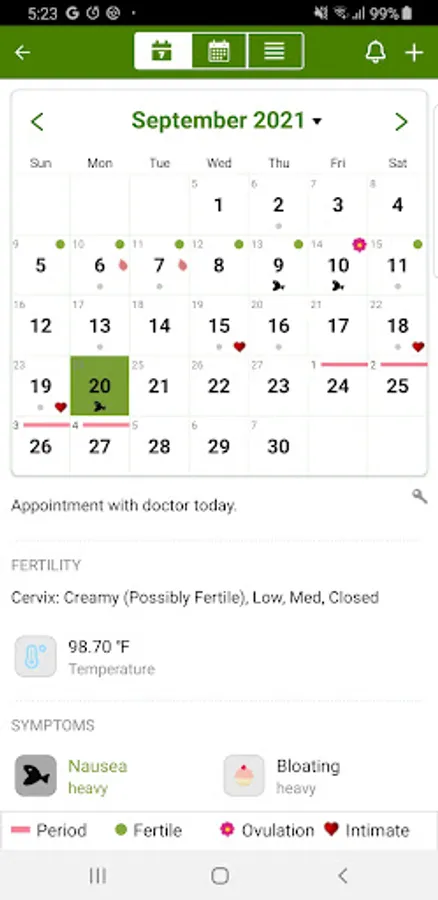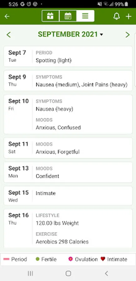* View your current and future period dates, ovulation and fertile days, your moods and your symptoms in a simple month-view calendar.