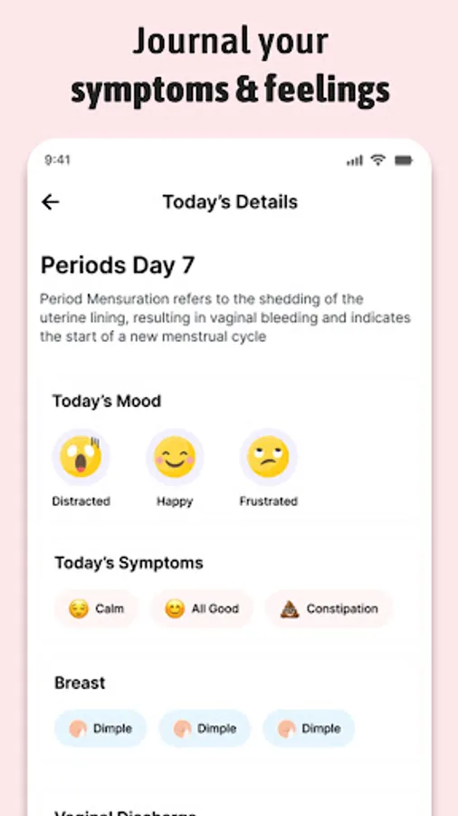 🌸 Monitor Health Symptoms:Period tracker free can also be used to track women's health such as mood, symptoms, headaches, cramps and many more so that users can identify patterns in their cycle. Record moods and emotions to log how you are feeling throughout the month.