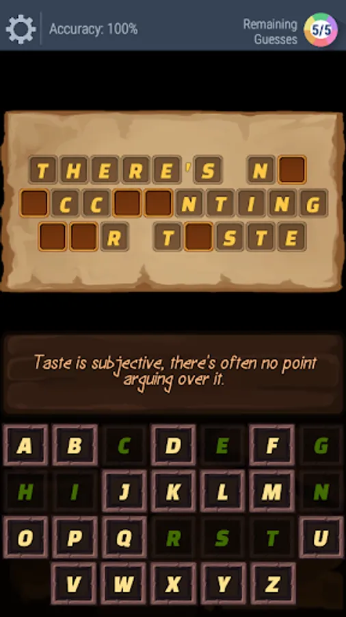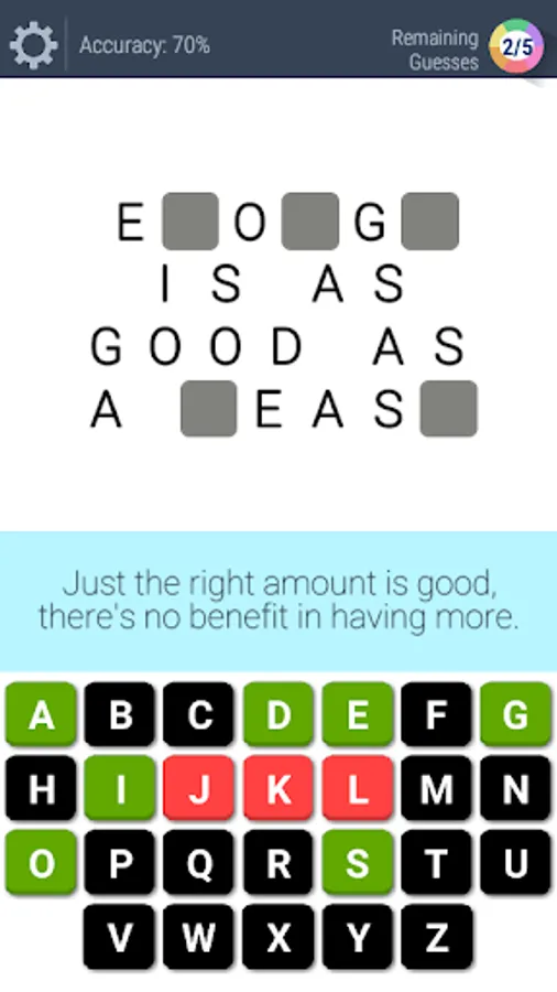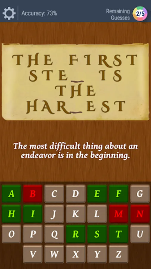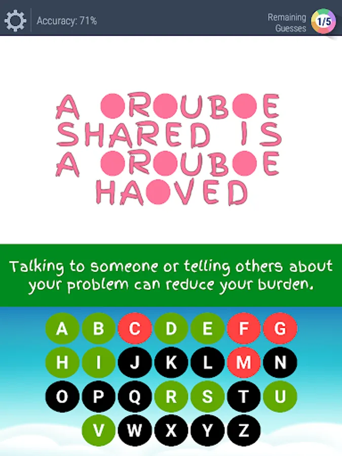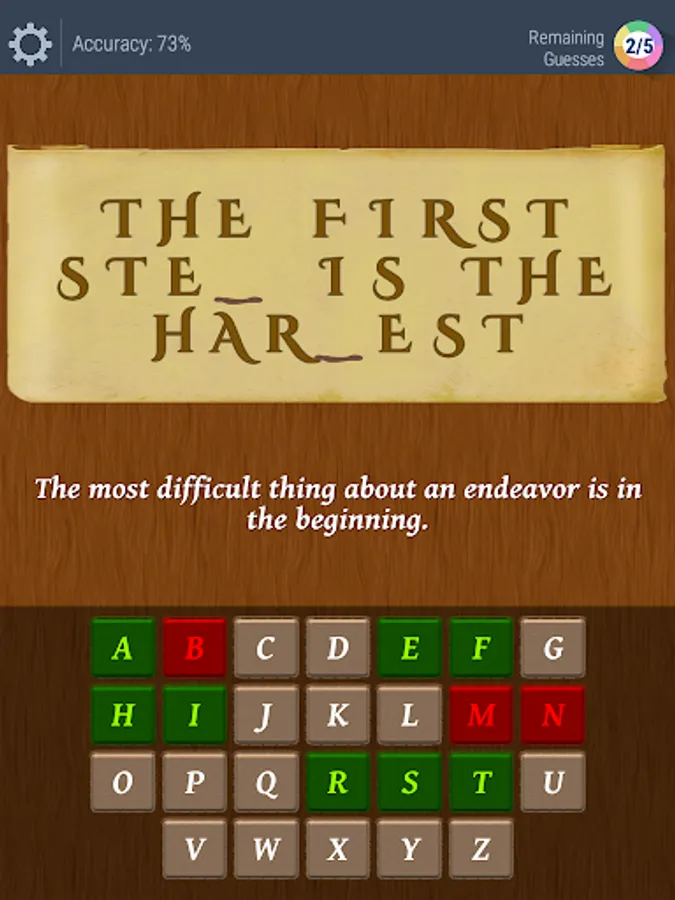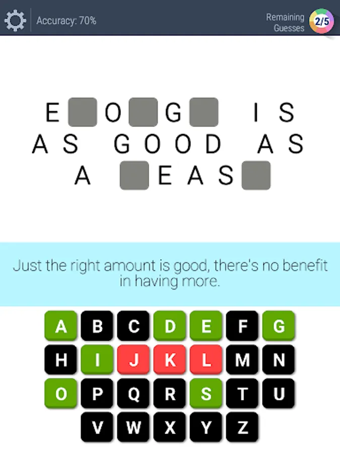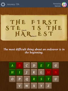 The game-play is similar to the classic Hangman game, but with proverbs, idioms, wise-sayings and famous quotes. You're presented with a fill-in-the-blank letters, along with alphabet letters which you can choose to fill in the grid, to complete the mystery phrase.