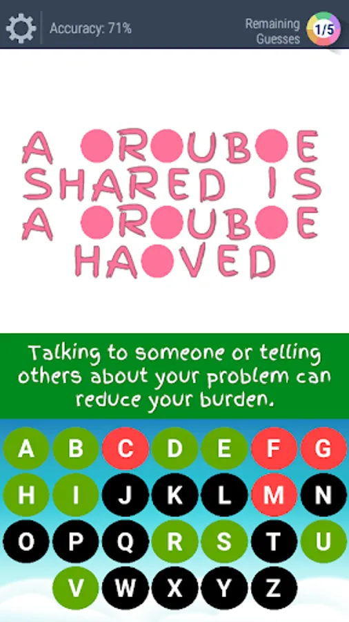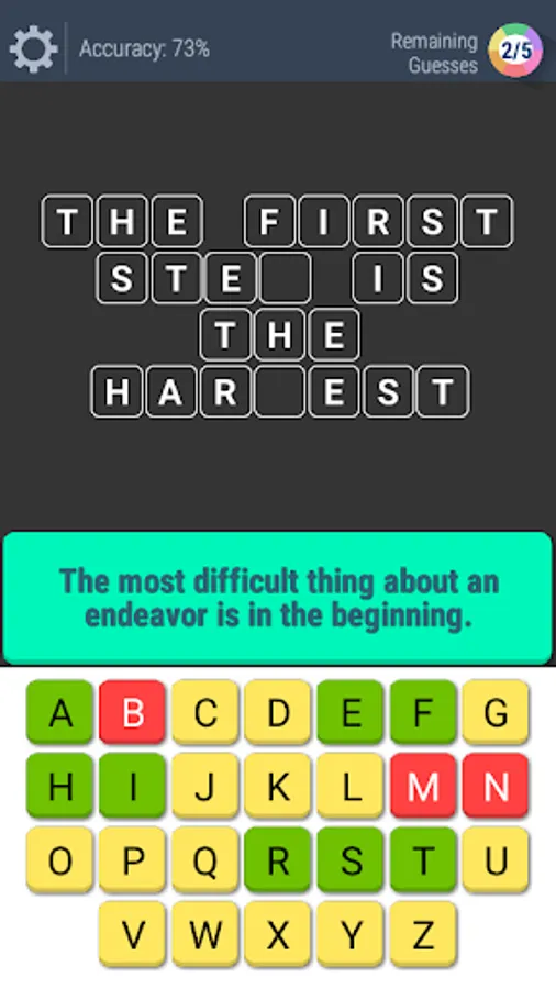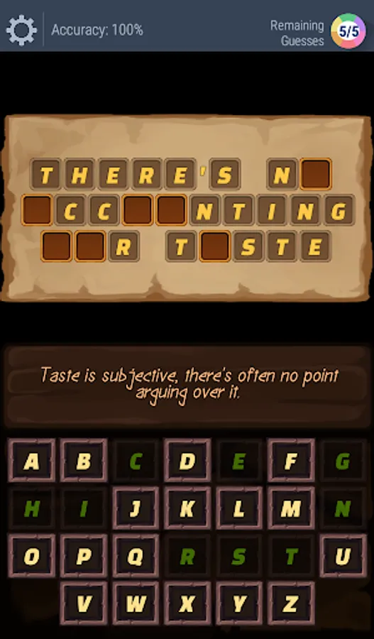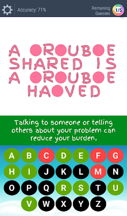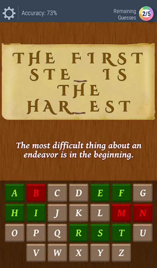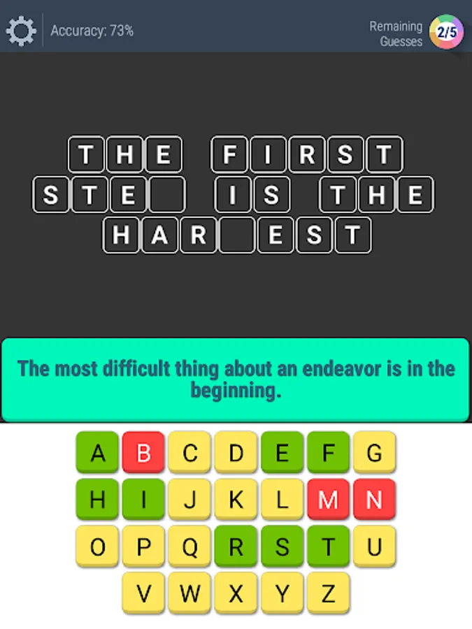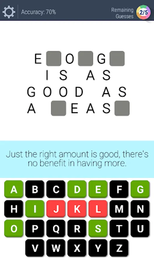 The game-play is similar to the classic Hangman game, but with proverbs, idioms, wise-sayings and famous quotes. You're presented with a fill-in-the-blank letters, along with alphabet letters which you can choose to fill in the grid, to complete the mystery phrase.