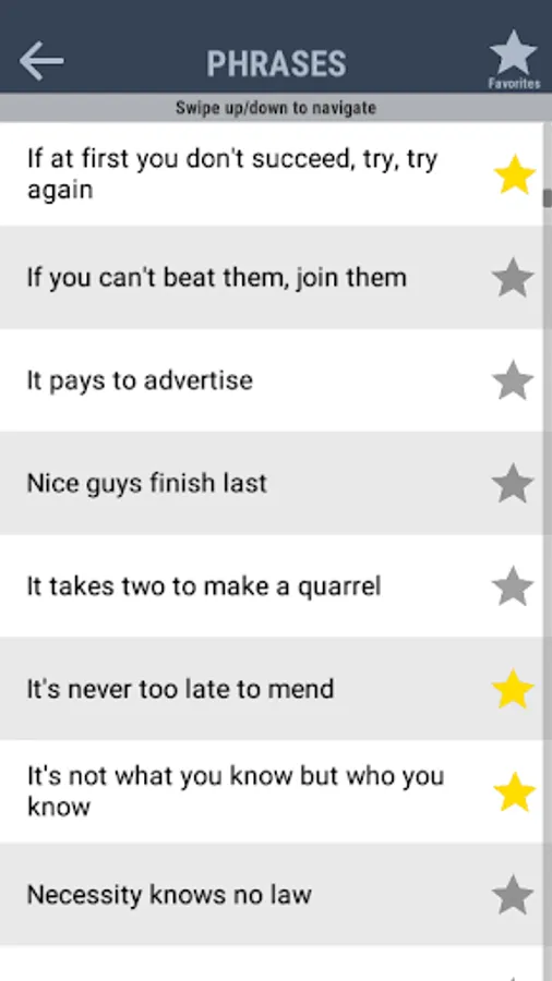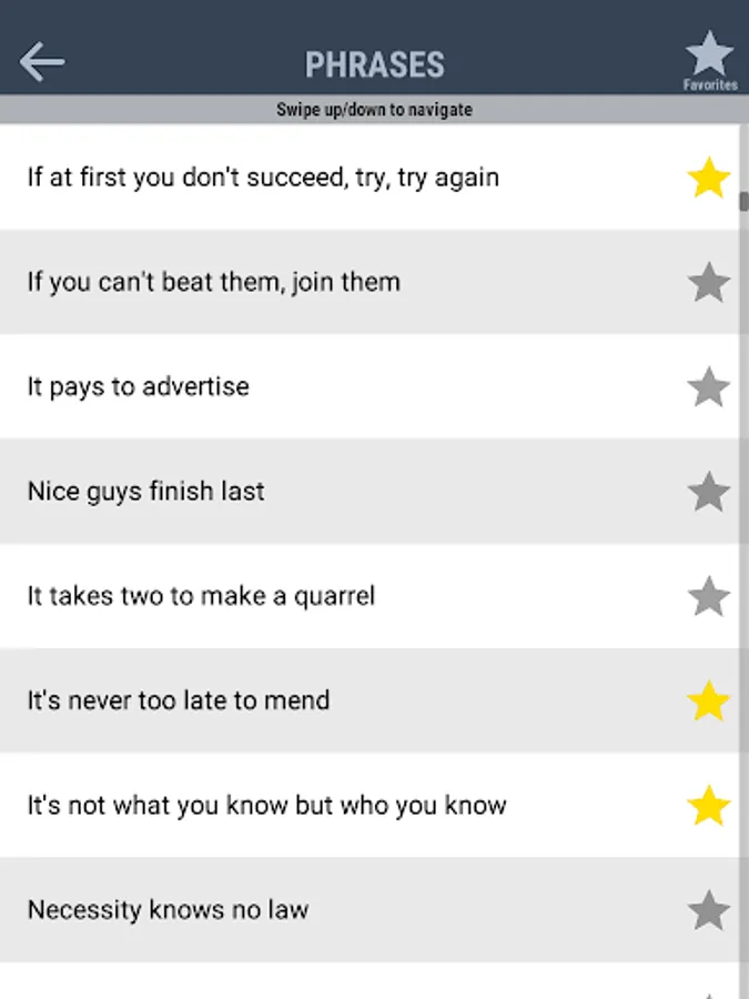- A favorite section, so you can mark your favorite proverbs and return to your favorite proverbs and idioms.