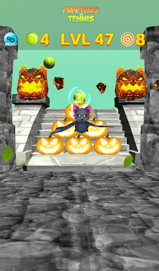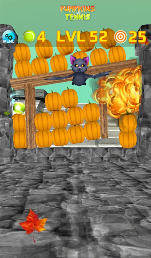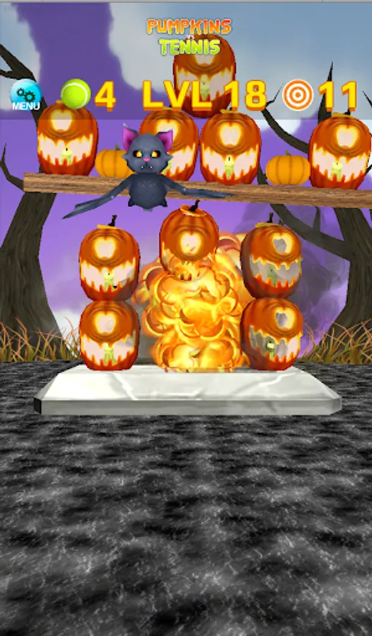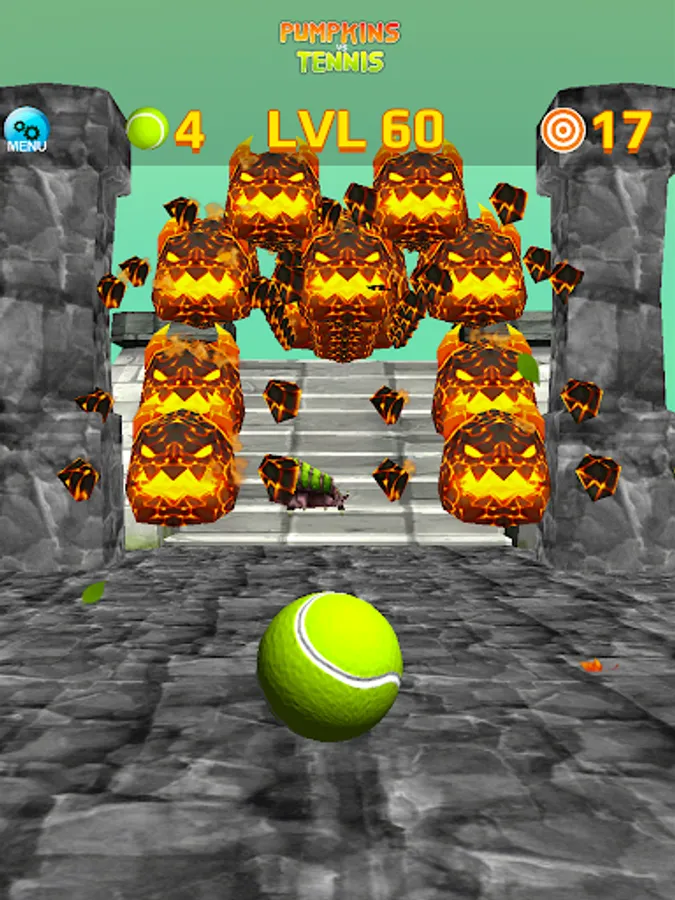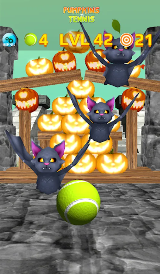 There are 60+ levels to conquer with various pumpkins, including exploding pumpkins, and angry-flying-monsters flying in formations. Since you have a limited number of tennis ball on each levels to destroy all the pumpkins, and many levels require some thinking, try to hit all the pumpkins with the least amount of throws. Try to earn the full star ratings by not only tumbling all the pumpkins but also completing the bonus goals.