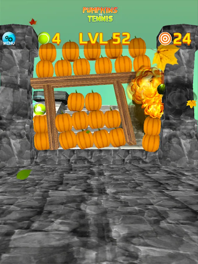 A "throw the balls and smashing-targets" game with spooky pumpkins and Halloween theme. Your task in the game is to knockdown all the pumpkins that are stacked in various formations. You have a limited number of tennis balls to knockdown and smash all of those pumpkins. Aim carefully and smash all of the targets to win. Just swipe the screen (the game can be played with one finger by swiping) to aim to the pumpkins and watch the balls hit the pumpkins in spectacular destruction.