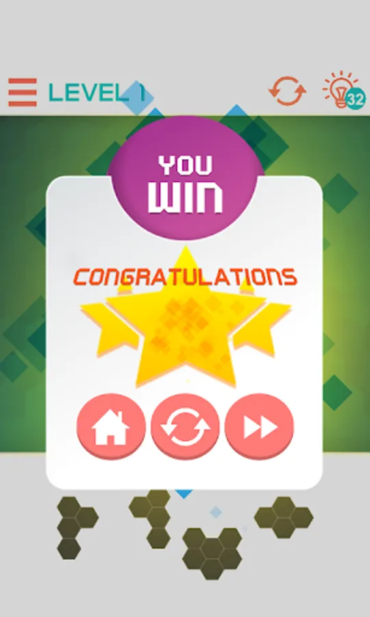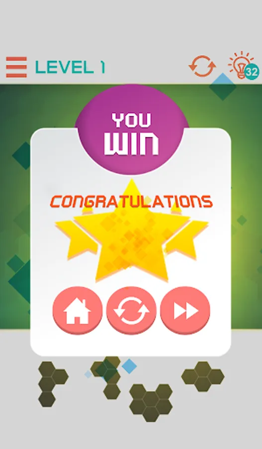 You win the game when all the shapes have been placed on the board (the board is completely filled with colorful hexagons).