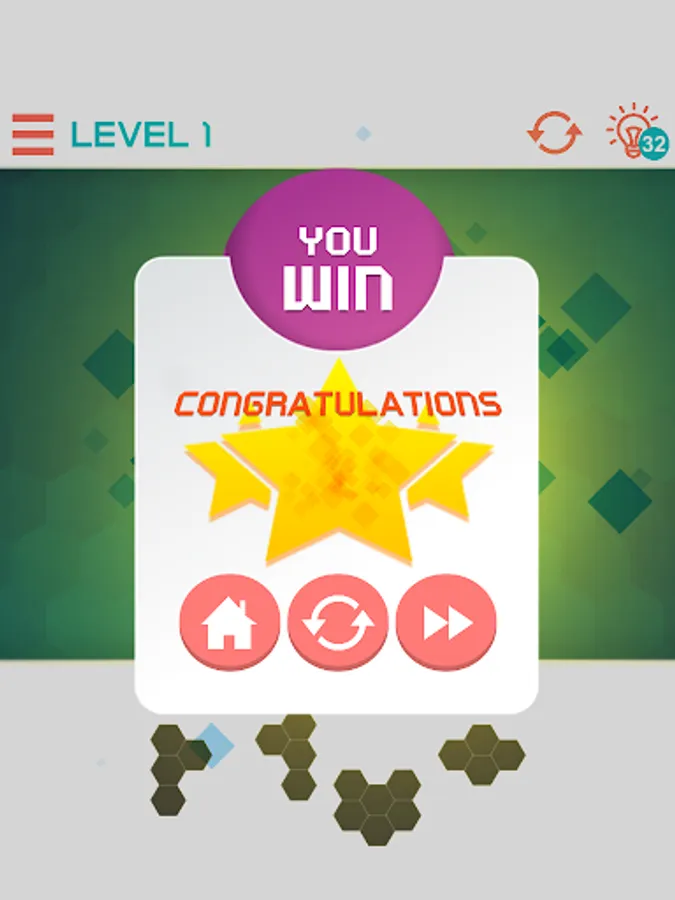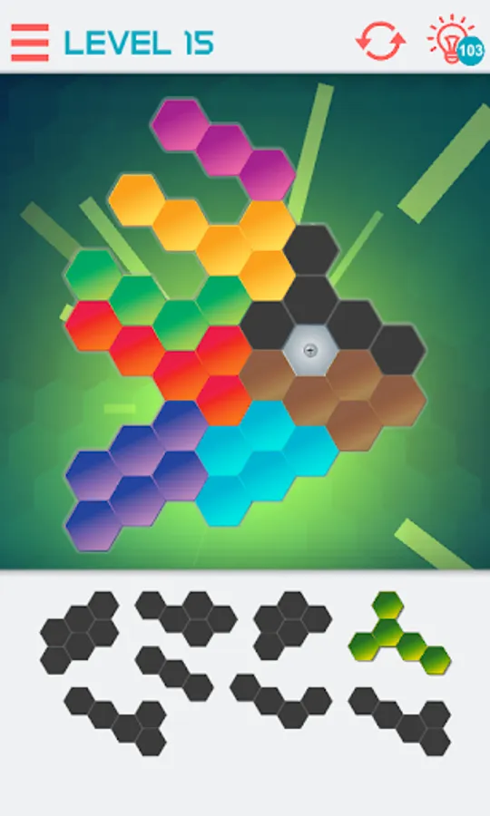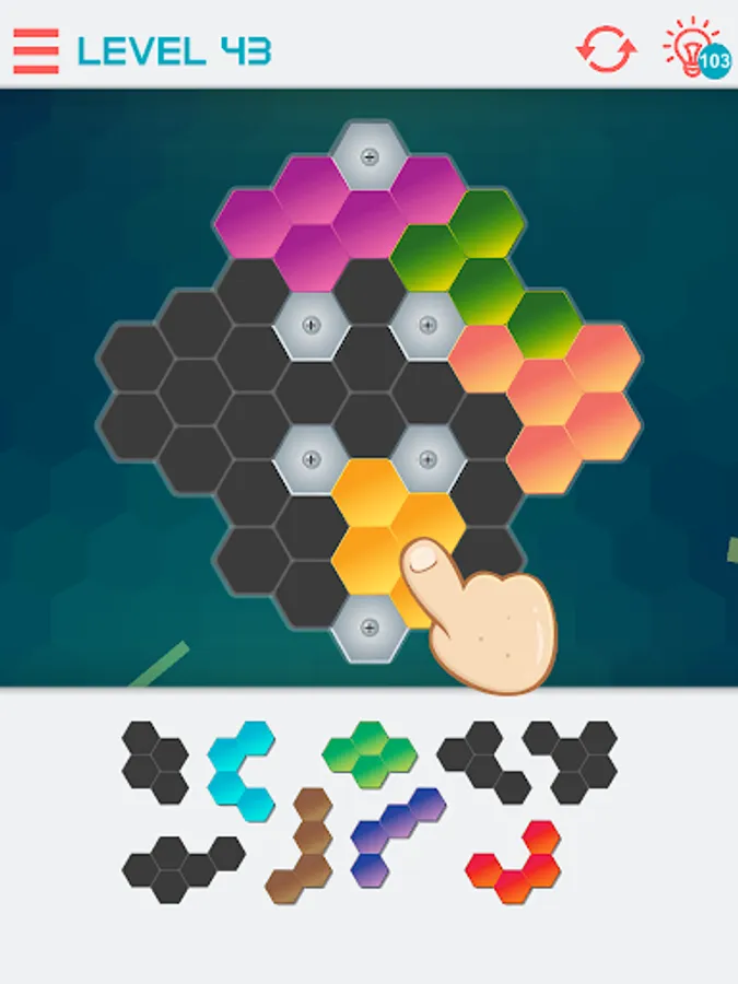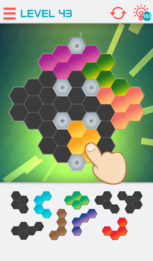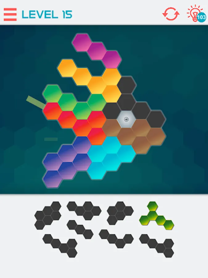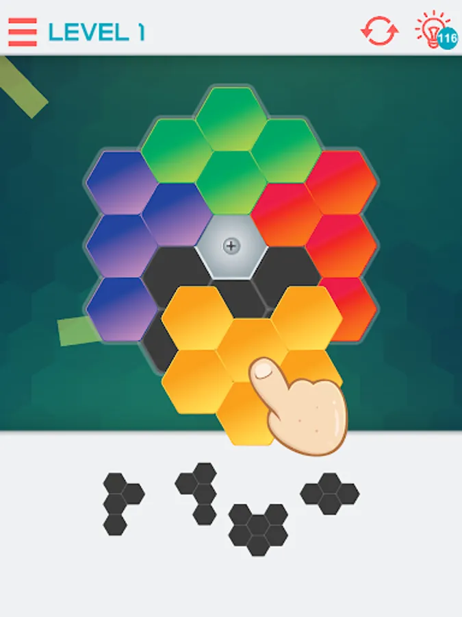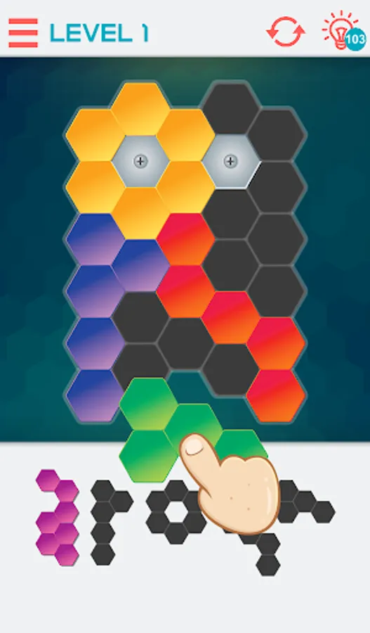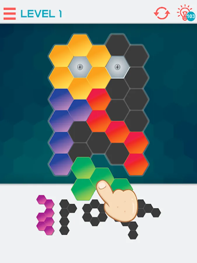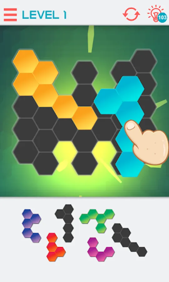 The rule of the game is very simple, anyone should be able to start playing immediately. On the middle of the screen, you are presented with a board consisting of hexagonal grids. On the bottom area of the screen, you are given drag-able shapes made of hexagons. Drag the shapes into the board and drop them. You can drop a shape onto the board as long as the shape match the grids and the grids are not occupied. When you drop the shapes, they will snap.