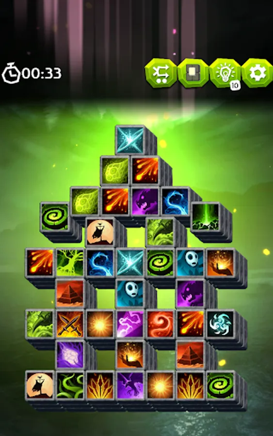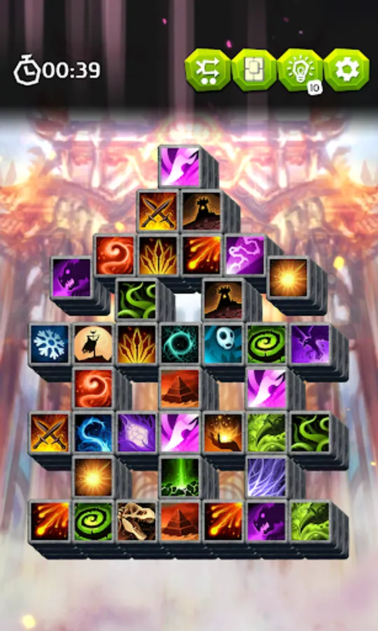 The game starts with tile-pieces stacked and arranged on the board, which vary in dimensions, forming structures such as pyramids, symmetrical, stacks, towers, abstract, or animal shapes. Every piece has a face (basically a symbol or a picture) denoting its "identity." Typically, in traditional classic Asian style mah-jongg, the symbols are circles, bamboos, Chinese letters, seasons, and dragon pictures. But here, they are colorful artwork from fantasy, role playing, RPG and magic realms.