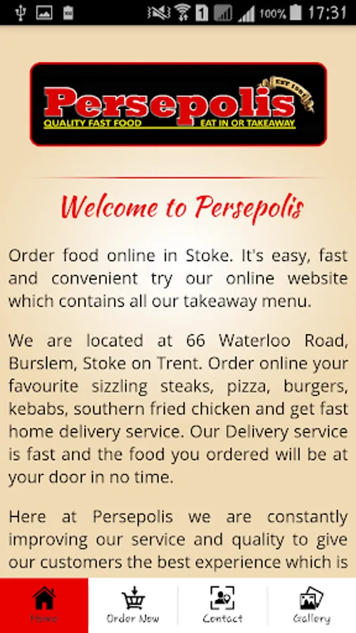 Thank you for visiting in Persepolis in Burslem. We hope you enjoy our online ordering app and your food.