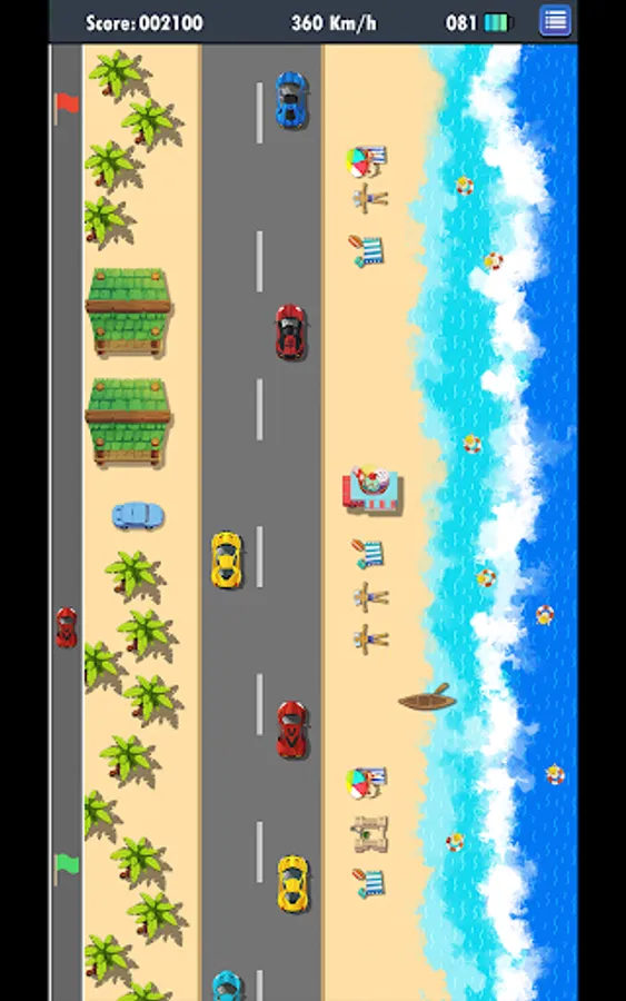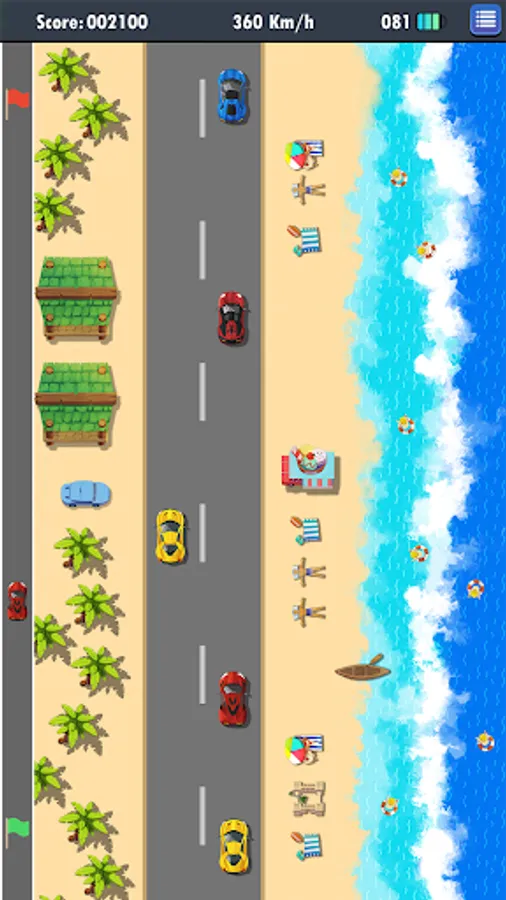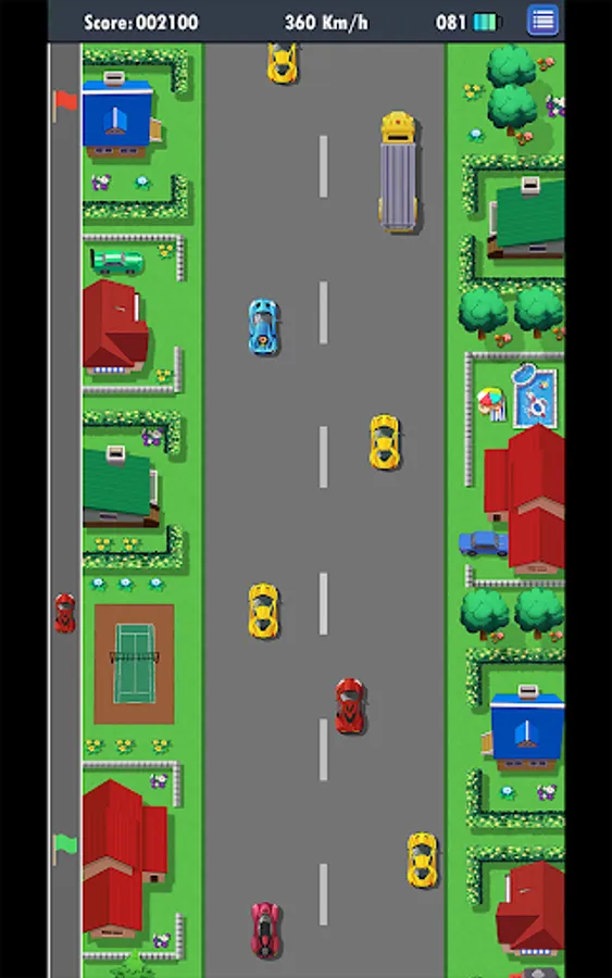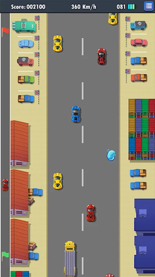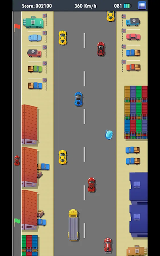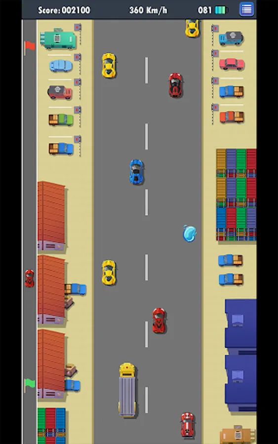 There are many type of obstacles in game: yellow car, blue car, red car, truck, potholes. Avoid colliding with them.