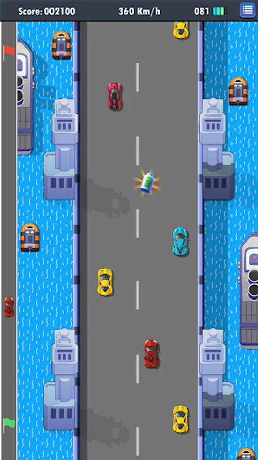 The player's speed is automatic increase to 360 km/h. The player has a limited amount of battery and can earn more by collect battery on the road. If the player crashes into the side barriers, the car will explosion and loss some battery unit.