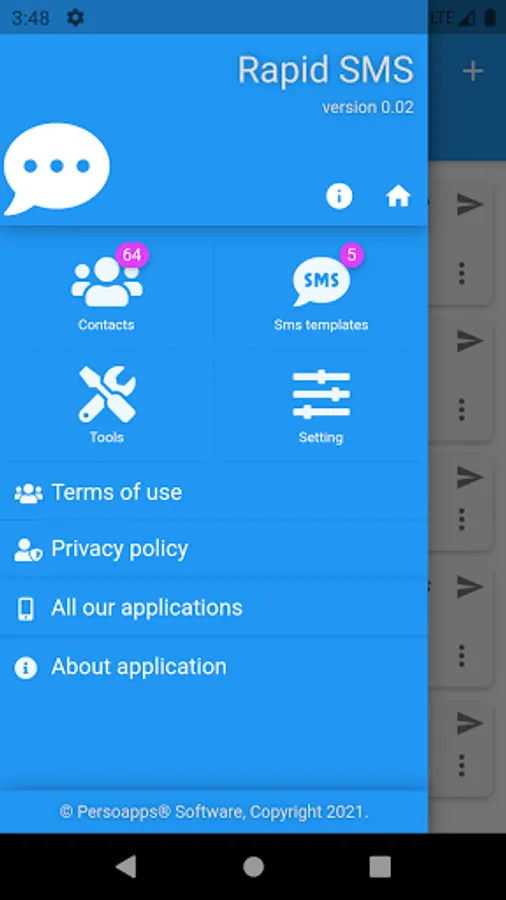 Create and manage your SMS templates. Select or enter contact and fill the message. Then tap the Sms to send same message quickly with no typing.