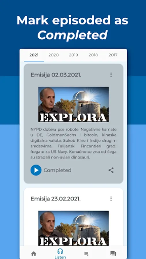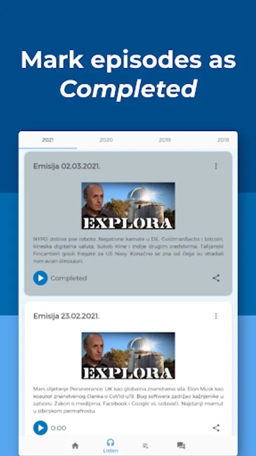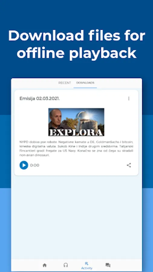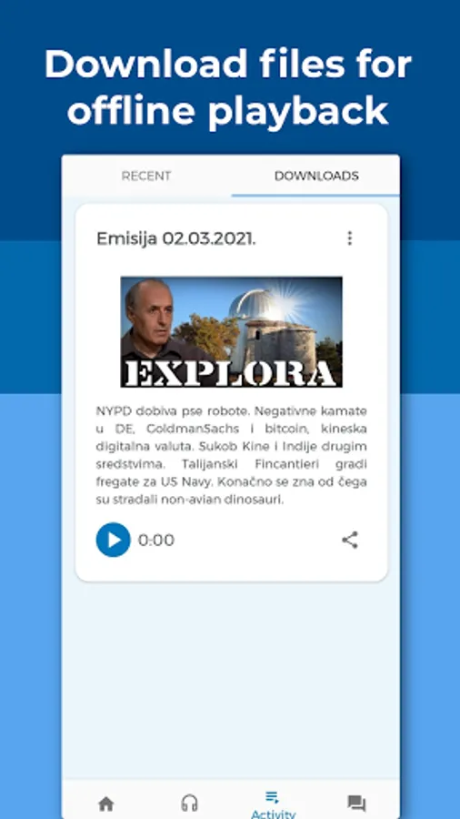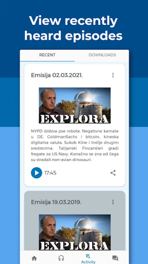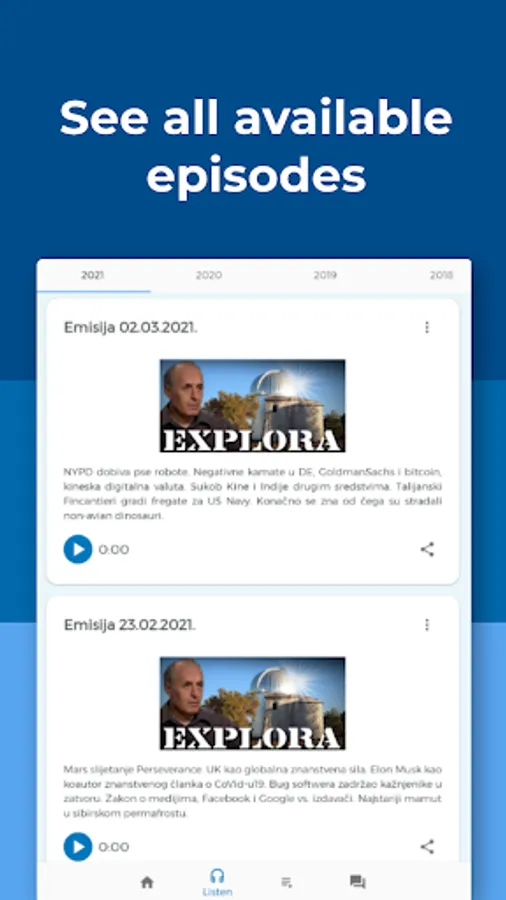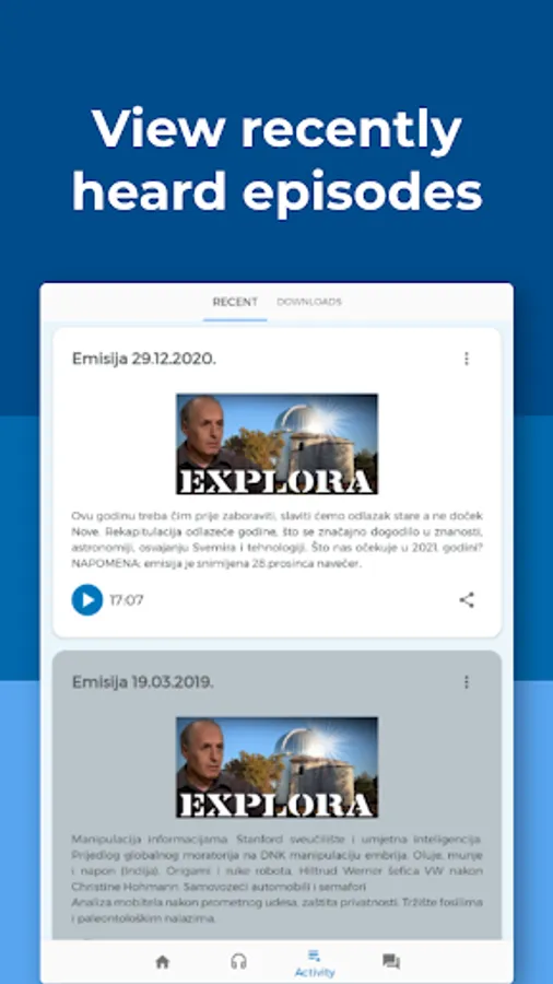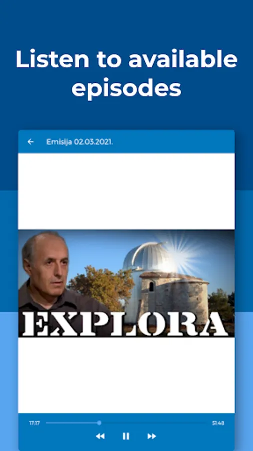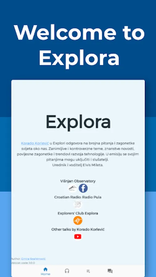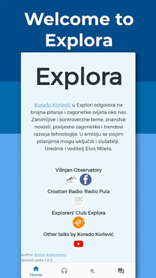 Explora is a Croatian radio show about science, technology, and astronomy, hosted by Korado Korlević and Elvis Mileta. Explora App aims to make the experience of listening to available episodes of Explora easier and more convenient.