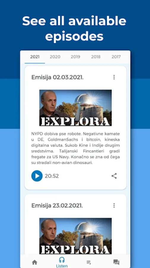 • Listen page with all available episodes of Explora categorized by year